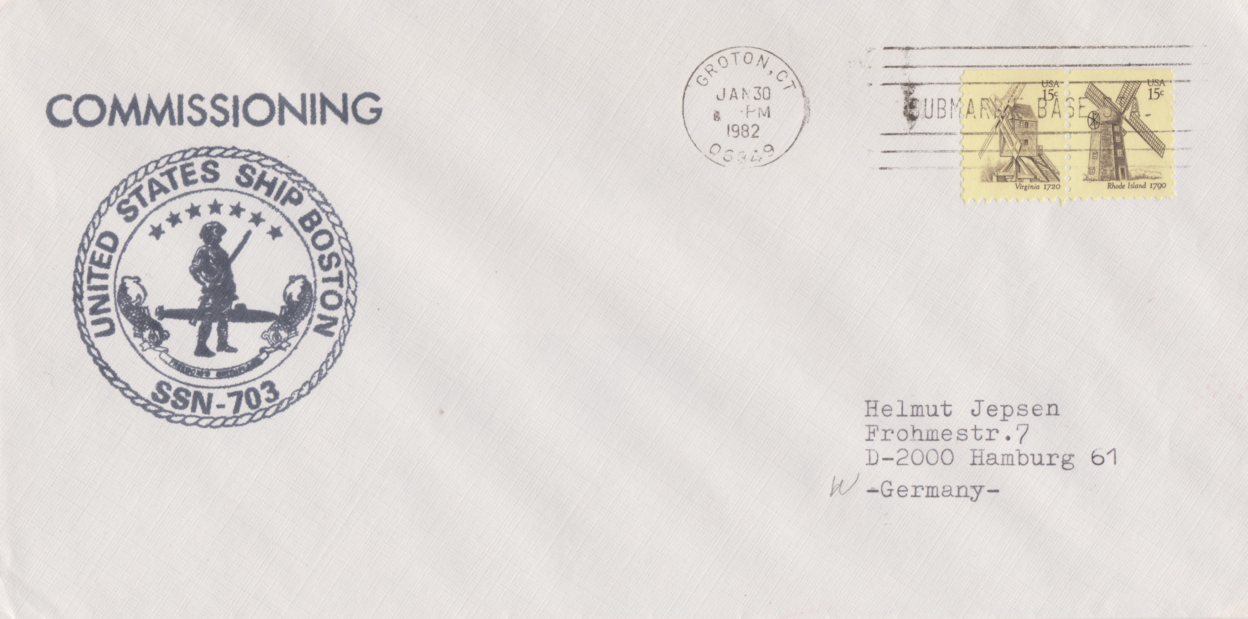 Dieser Beleg dokumentiert die Indienststellung der USS BOSTON (SSN-703) am 30.01.1982: