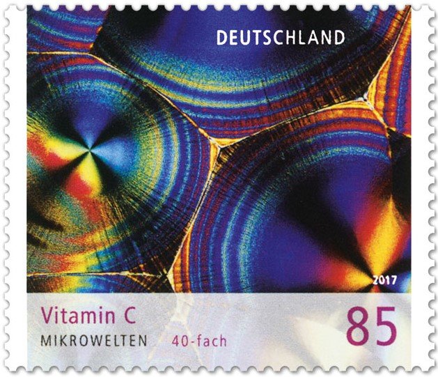 Bei der Deutschen Post ist am 13.7.2017 in der Serie "Mikrowelten" eine Marke (MiNr 3323) mit einer Abbildung des Vitamin C in einer 40-fache Vergrößerung erschienen.