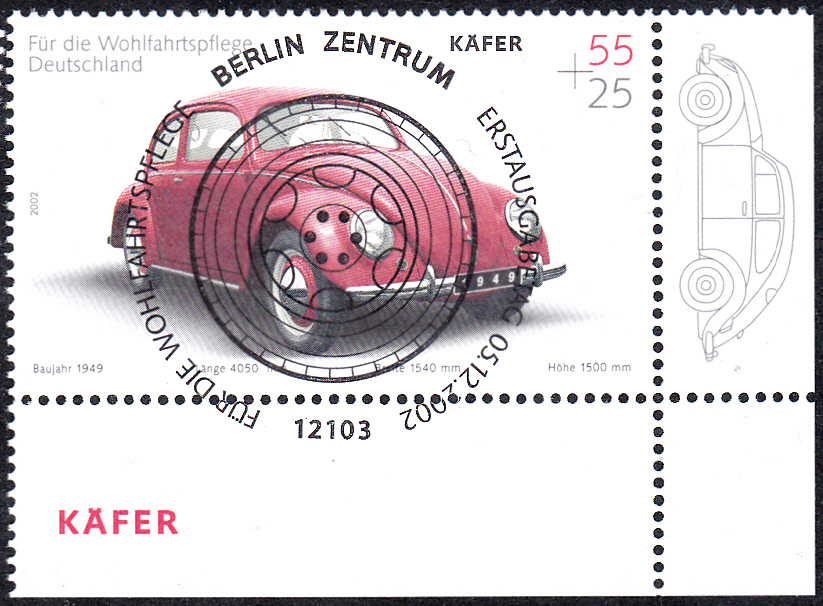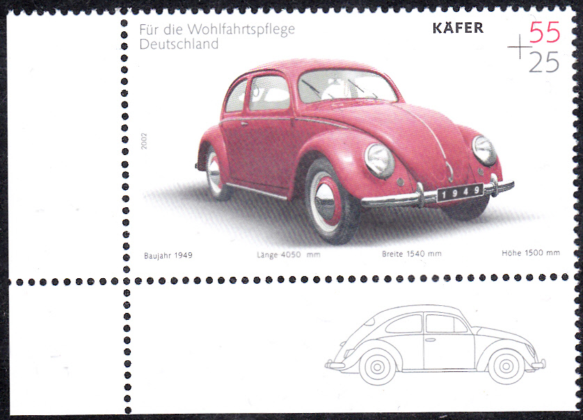 Eine Marke zu 55+25 Cent aus der Wohlfahrtsmarkenserie 2002 (MiNr 2292) zeigt einen VW Käfer aus dem Jahre 1949. Hier eine Marke vom linken unteren Bogenrand, Auf dem Bogenrand ist auch eine Zeichnung des VW Käfer zu sehen.