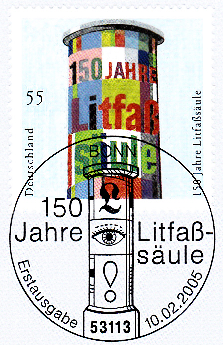 In Berlin ist 1979 diese Marke (MiNr 612) zum Jubiläum "125 Jahre Litfaßsäulen" mit einer Straßenszene mit Litfaßsäule.