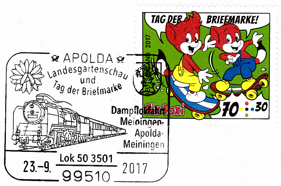Dieser Sonderstempel vom 23.9.2017 aus Apolda hat einen Bezug zum Tag der Briefmarke 2017 und zur Bundesgartenschau. Im Stempelbild wird eine Dampflokomotive gezeigt.