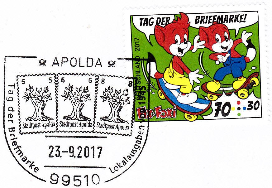 In Apolda wurde am 23.9.2017 ein weiterer Sonderstempel zum Tag der Briefmarke eingesetzt. Dieser Stempel zeigt drei Lokalausgaben von Apolda.