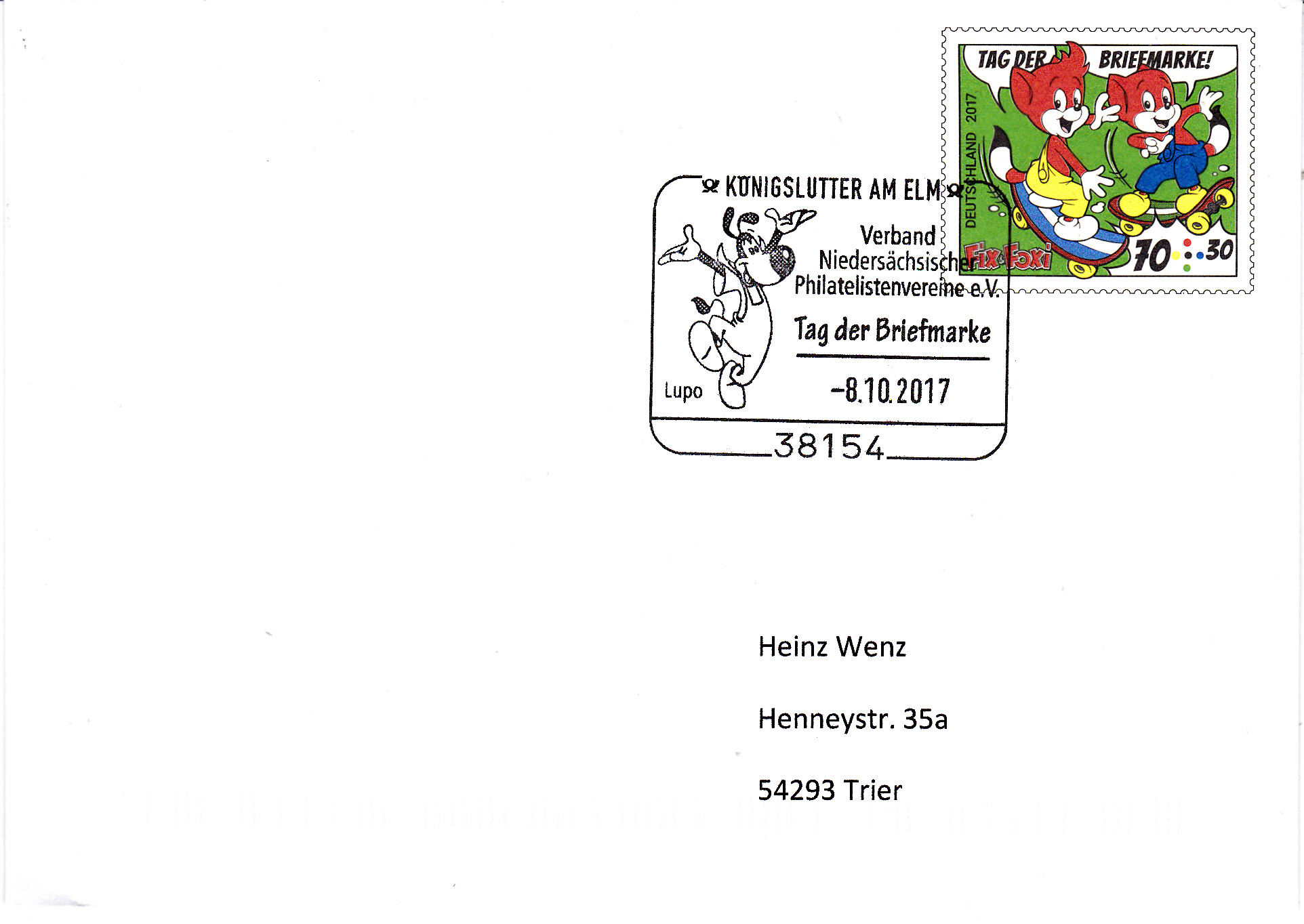 In Königslutter am Elm gab es am 8.10.2017 einen Sonderstempel zum Tag der Briefmarke mit der Comic-Figur Lupo im Stempelbild.