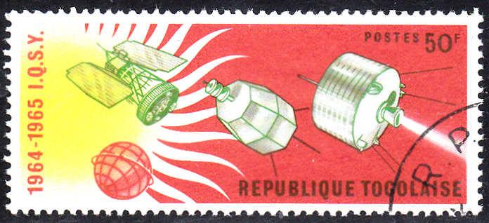 Diese Marke aus Monaco (MiNr 800) aus der Serie "100 Jahre Internationale Fernmeldeunion" zeigt einen der beiden Satelliten "Relay" und einen Teil der Erdkugel.