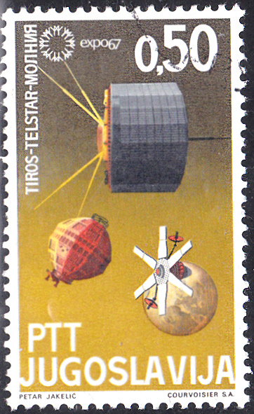 Auf dieser Marke aus Jugoslawien (MiNr 1217) werden die beiden Nachrichtensatelliten "Telstar" und "Molnija" (unten) und der Wettersatellit "Tiros" gezeigt.