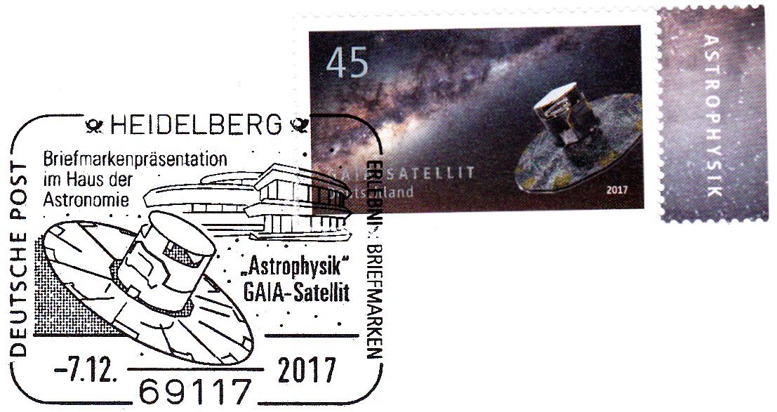 Bei der Deutschen Post ist am 7.12.2017 eine Marke (MiNr 3347) mit einer Abbildung des ESA-Satelliten "Gaia" vor der Milchstraße. Hier eine Marke vom Eckrand mit EAN-Code.