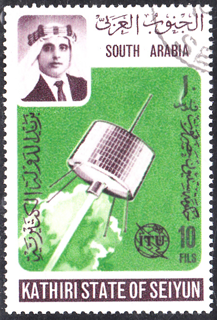 In Aden, Kathiri State of Seiyun (das war bis 1967ein Sultanat im heutigen Südjemen) erschien in einer Serie "100 Jahre Internationale Fernmeldeunion" auch eine Marke (MiNr 85 A) mit einem Nachrichtensatelliten vom Typ Syncom.