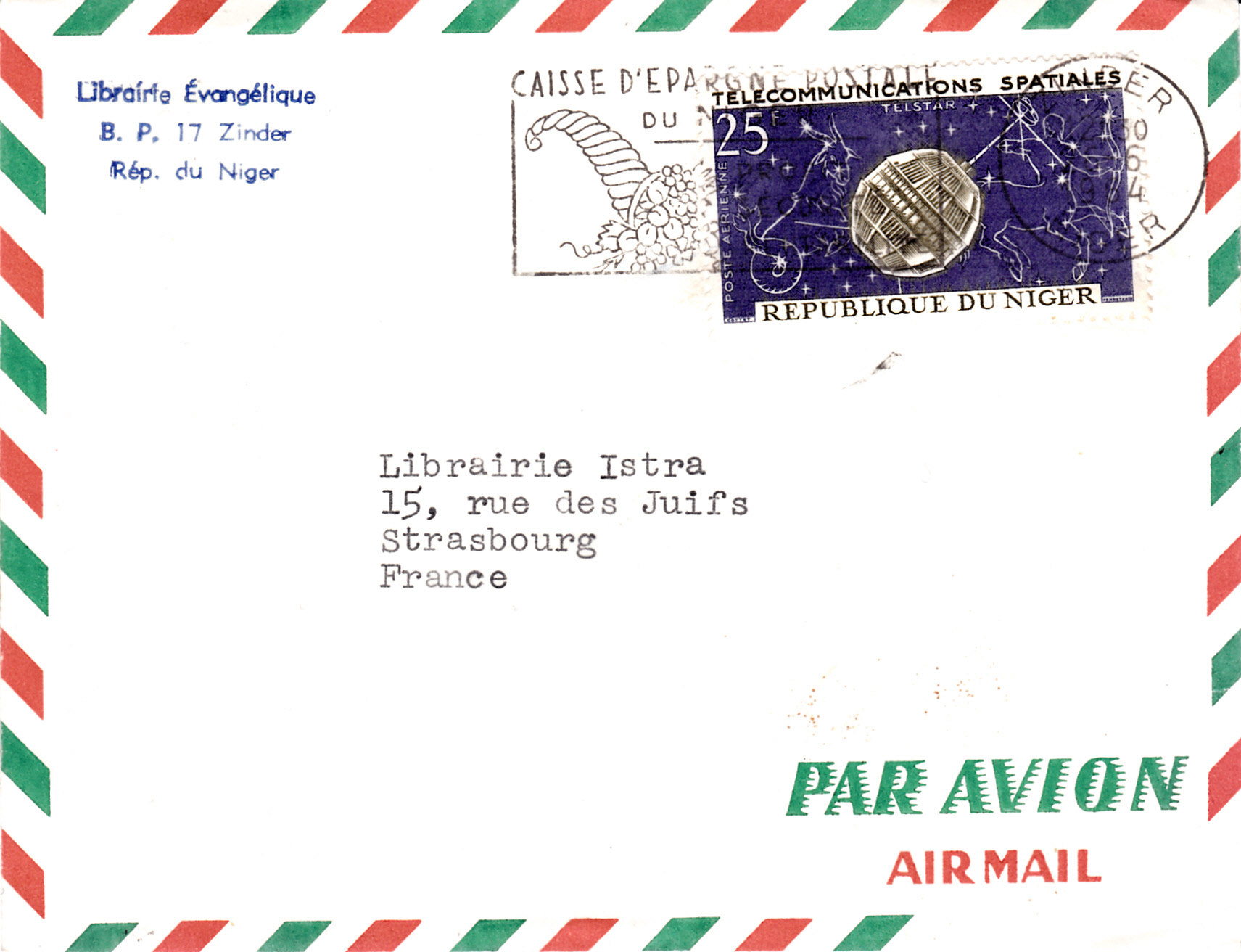 Im Niger ist ebenfalls eine Marke (MiNr 59) mit dem Nachrichtensatelliten Telstar erschienen. Hier zeige icheinen Brief nach Frankreich mit dieser Marke.