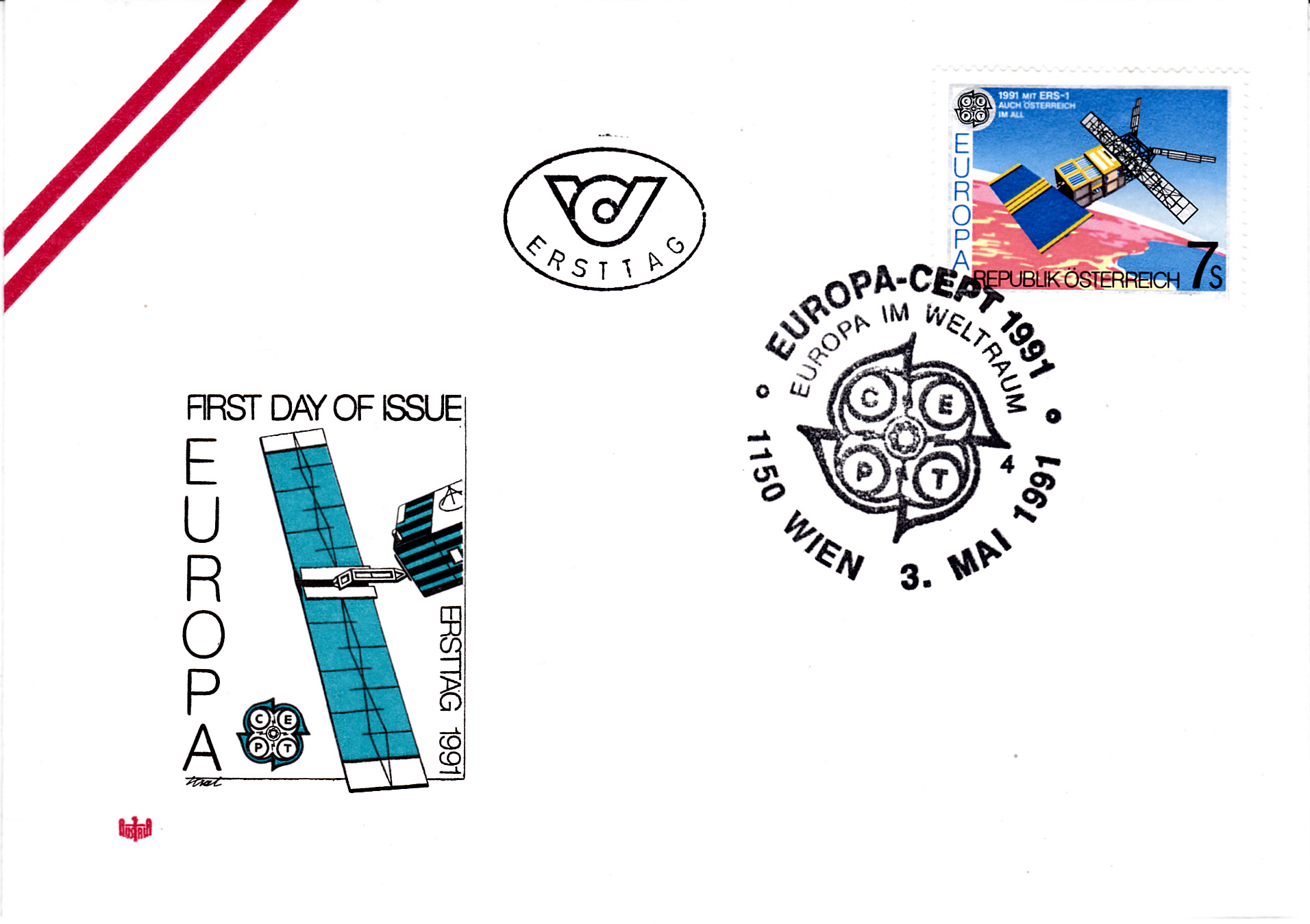 FDC mit der hier bereits gezeigten Europamarken 1991 aus Österreich (MiNr 2026) mit der Abbildung des Erdbeobachtungssatelliten "ERS-1".
