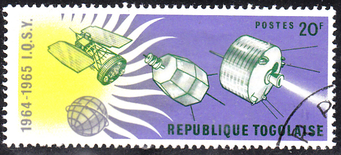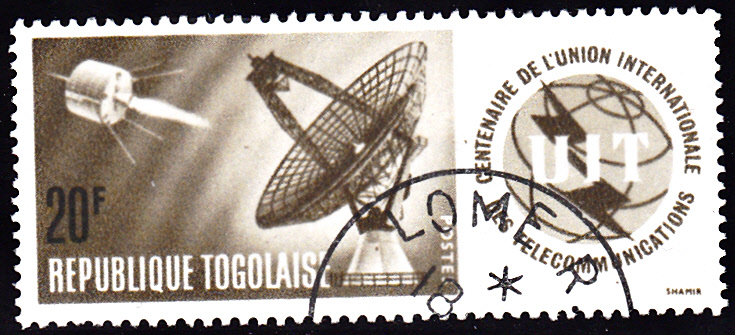 Diese Marke aus Monaco (MiNr 798) aus der Serie "100 Jahre Internationale Fernmeldeunion" zeigt den Satelliten "Syncom II" und die Erdkugel.