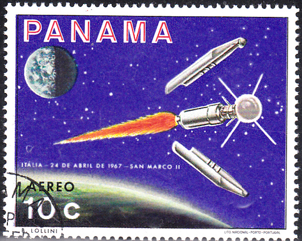 Aus einer Serie aus Panama zum Thema "Italienischer Beitrag zur Raumforschung" stammt diese Marke (MiNr 892) mit der Abbildung der "Scout"-Trägerrake mit dem Hochatmosphären-Forschungssatellit "San Marco 1" beim Start.