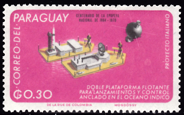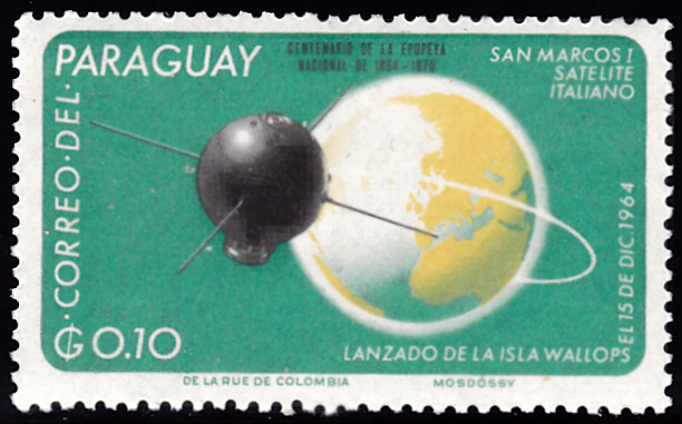 Inn Paraguay ist in einer Serie "Italiens Beitrag zur Weltraumfahrt" diese Marke (MiNr 1591 erschienen. Sie zeigt den Italienischen Satellit "an Marco 1" auf seiner Bahn um die Erde.