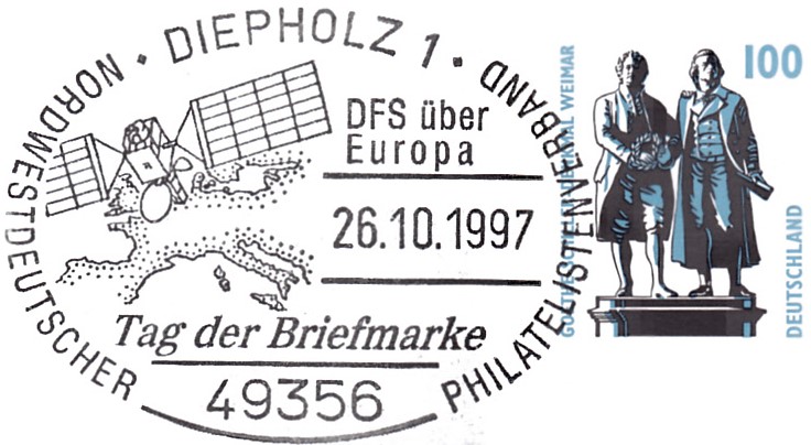 Im Sonderstempel zum Tag der Briefmarke 1997 vom 26.10.1997 aus Diepholz wird der DFS-Kopernikus über Europa gezeigt.