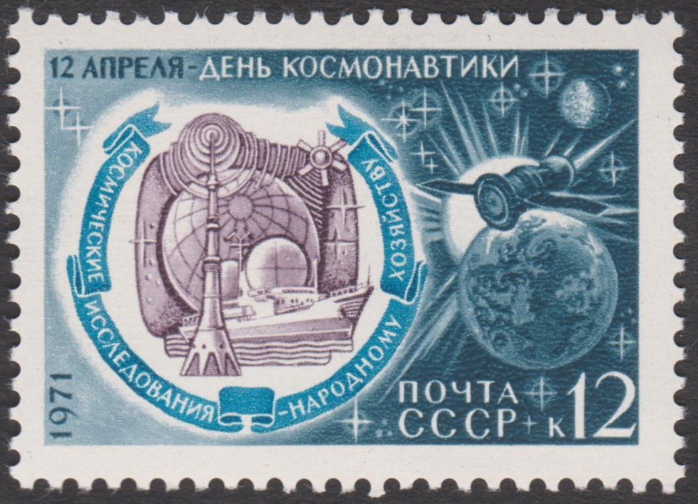 Dieses am 30.03.1971 erschienene Postwertzeichen, Sowjetunion MiNr. 3868, zeigt Motive zum Thema "Weltraumforschung" - Nachrichtensystem Orbita:
