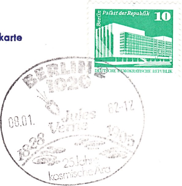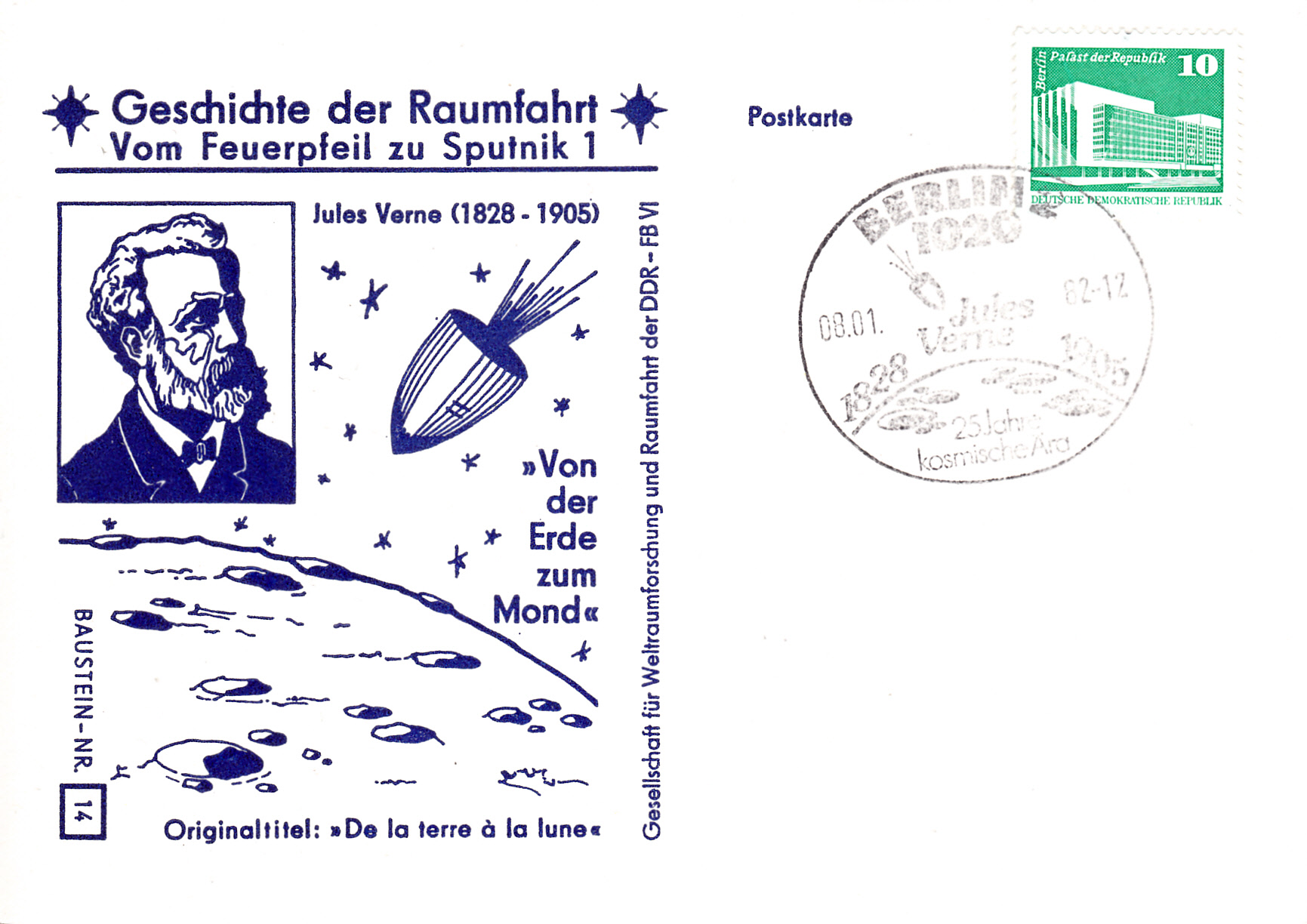 Auf diesem Sonderstempel aus Berlin vom 8.1.1982 wird Jules Verne für seinen Roman "Von der Erde zum Mond" geehrt.