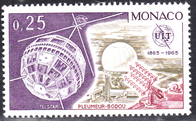 Diese Marke aus Monaco (MiNr 802) aus der Serie "100 Jahre Internationale Fernmeldeunion" zeigt einen der Satelliten "Telstar" und die Bodenempfangsstation Pleumeur-Bodou.
