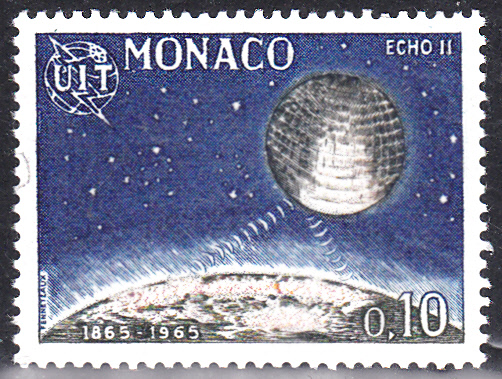 Diese Marke aus Monaco (MiNr 799) aus der Serie "100 Jahre Internationale Fernmeldeunion" zeigt den Satelliten "Echo II" und einen Teil der Erdkugel.
