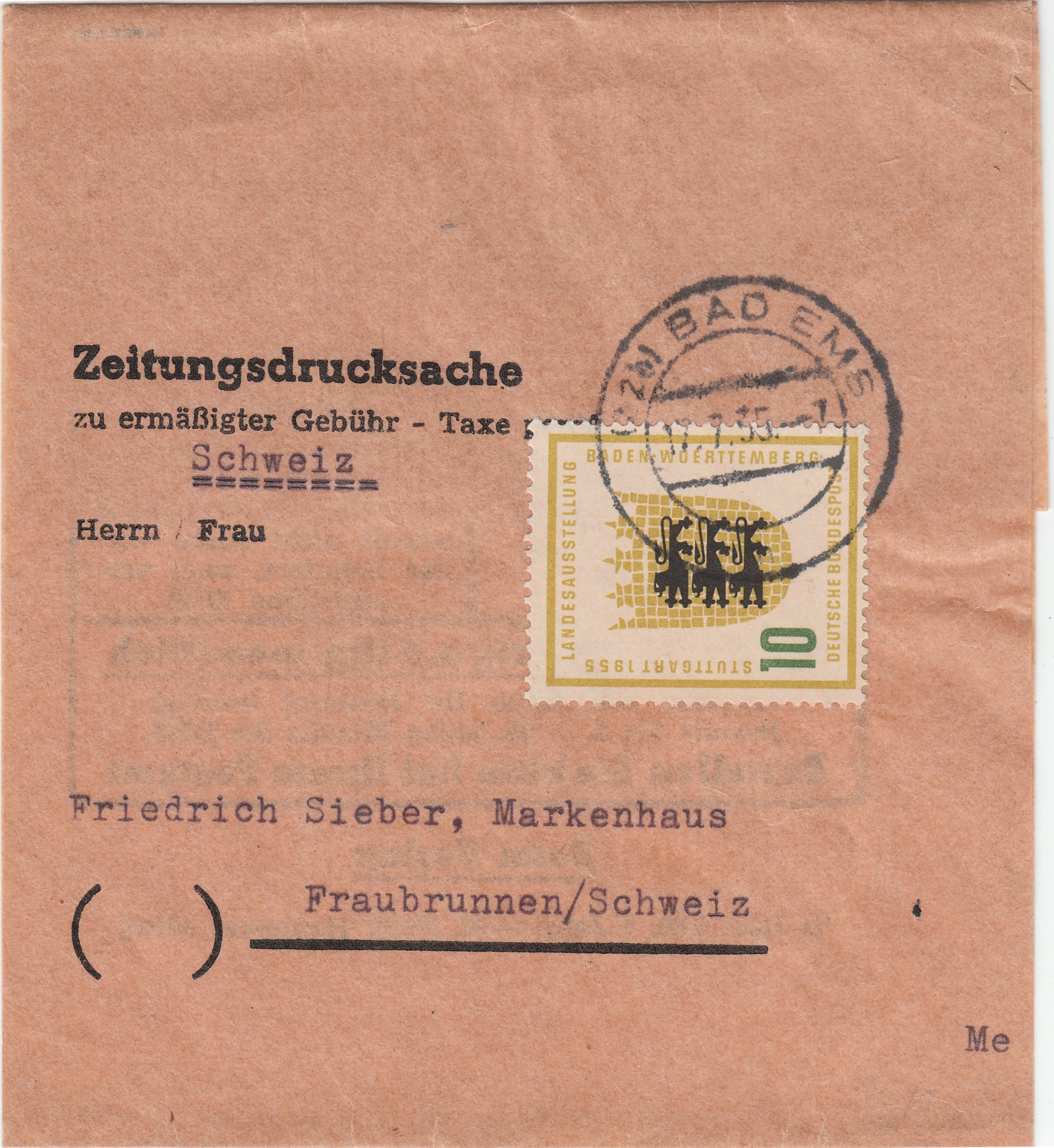 EF der MiNr. 213, am 17.07.1955 portorichtig als Zeitungsdrucksache zu ermäßigter Gebühr ins Ausland bis 100 g, hier in die Schweiz gelaufen: