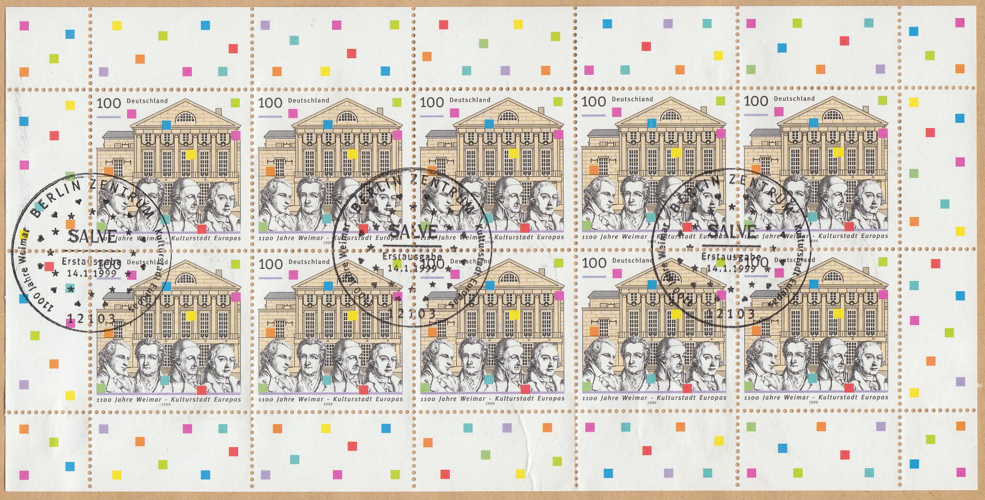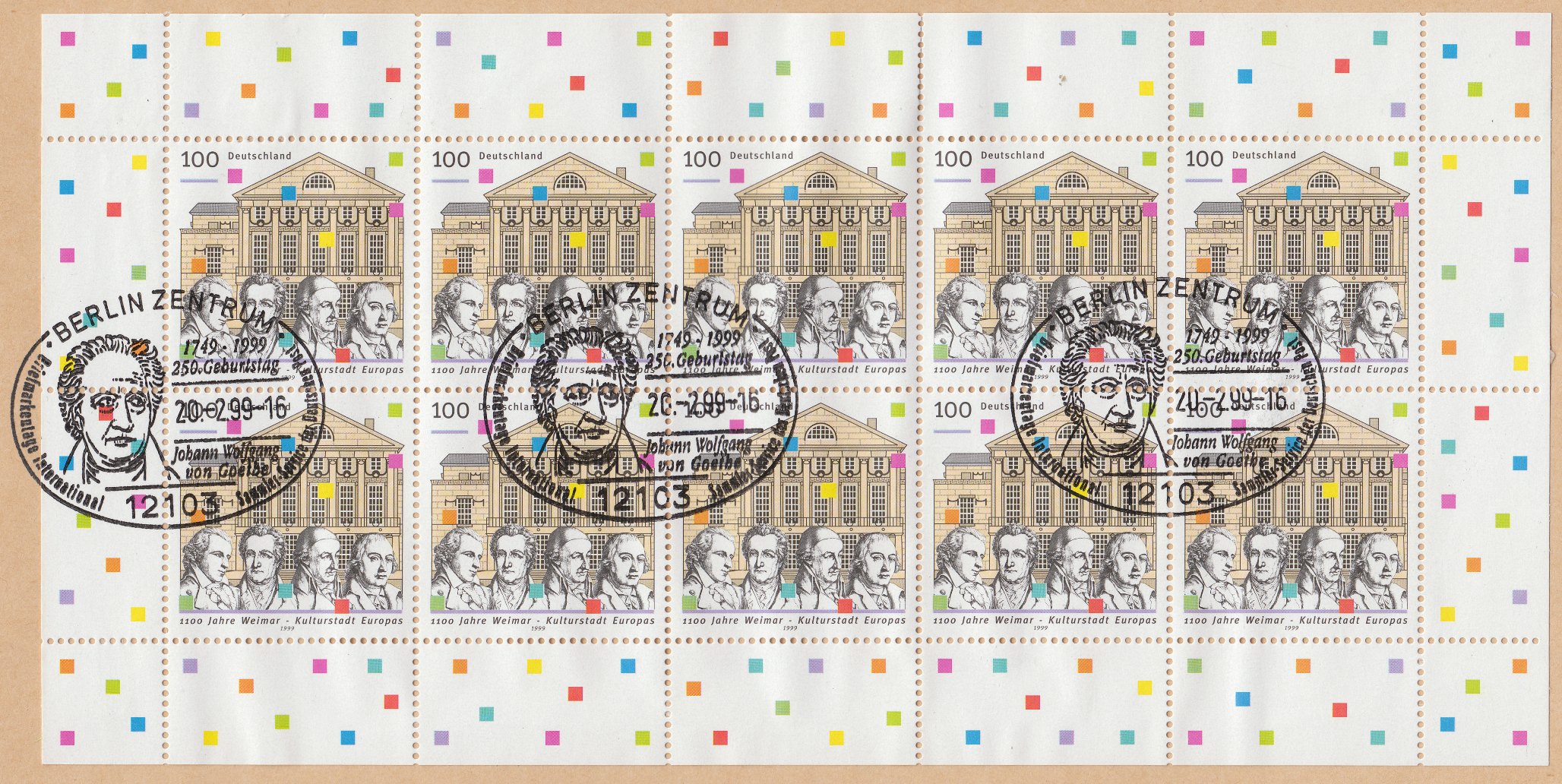 Schaut man sich die einzelnen Marken genauer an dann findet man auf Feld 2, also bei der zweiten Marke von links in der oberen Reihe, den Plattenfehler MiNr. 2028 X, "Locke" links an Goethes Kopf unter dem Geländer: