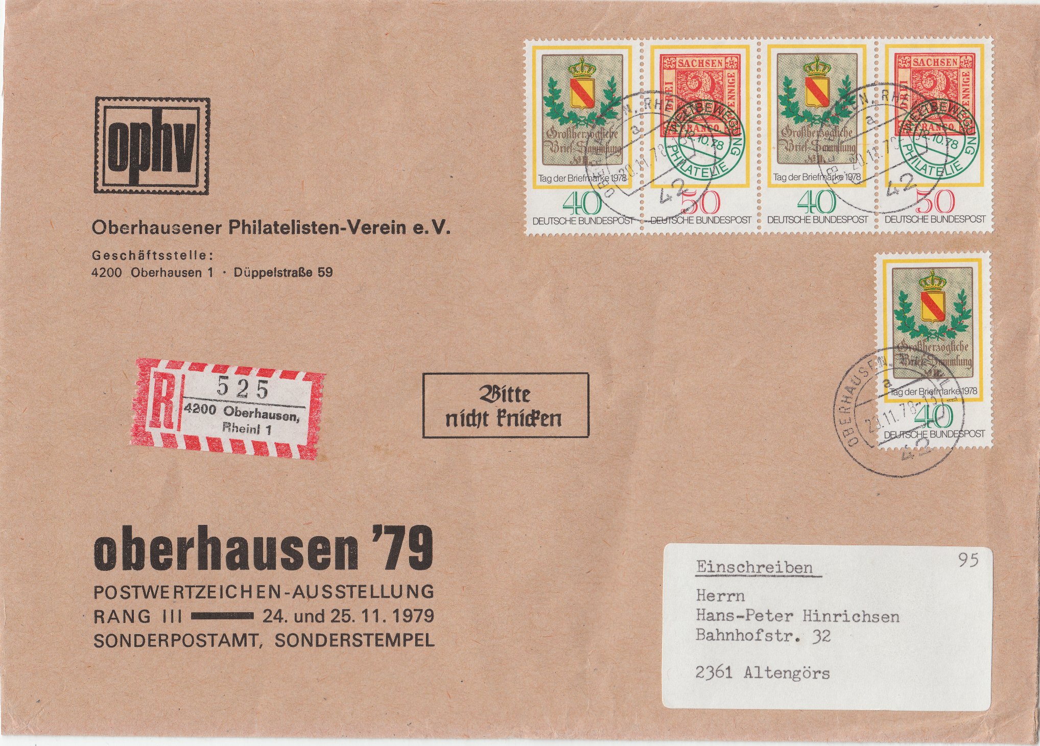 Wohl fast jeder Briefmarkensammler träumt davon, irgend wann einmal eine "Sachsen Dreier" in seine Sammlung aufnehmen zu können. Mit der MiNr. 981 kann man immerhin ein Abbild der Sachsen MiNr. 1 ohne großen finanziellen Aufwand in seine Sammlung integrieren. Die Marke erschien als Satz im Zusammendruck mit der MiNr. 980. Hier ein Brief vom 20.11.1978, mit 220 Pf portorichtig frankiert in der zweiten Gewichtsstufe von 21 bis 50 g (80 Pf) per Einschreiben (140 Pf):