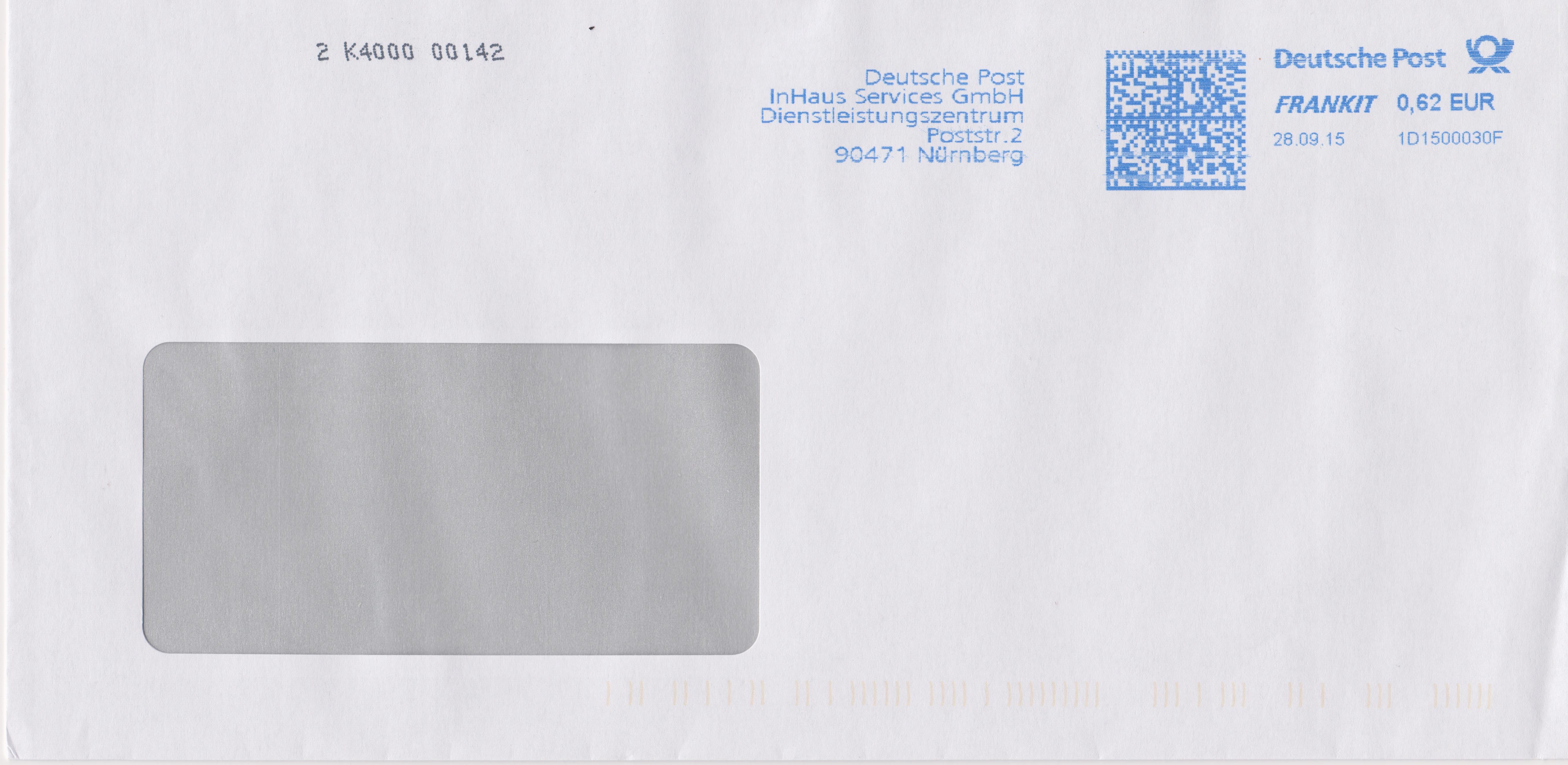 "FRANKIT"-Brief vom 28.09.2015, Portostufe 0,62 €, mit Adressenangabe "Deutsche Post, InHaus Services GmbH, Dienstleistungszentrum, Poststr. 2, 90471 Nürnberg".