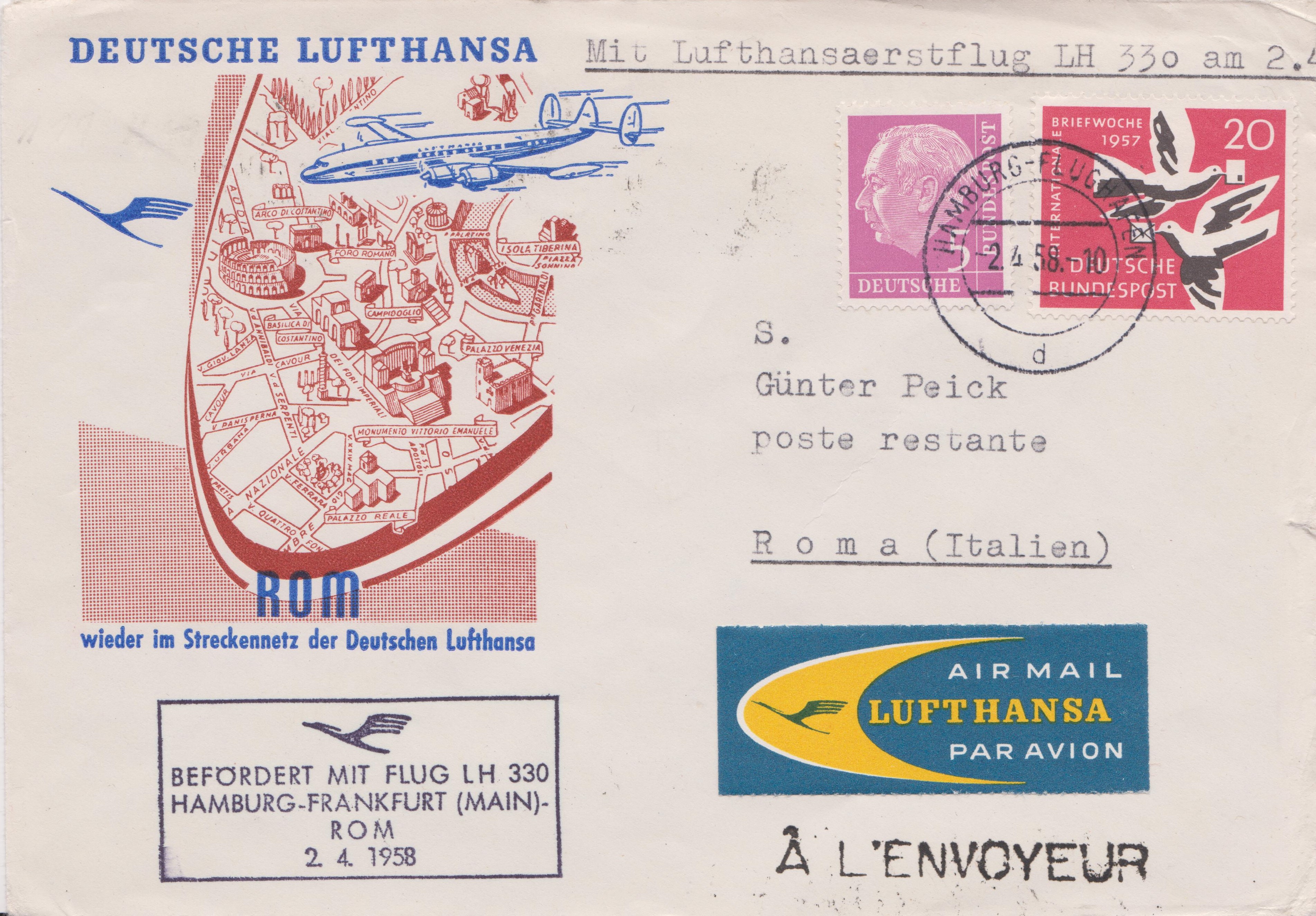 HAMBURG-FLUGHAFEN und "BEFÖRDERT MIT FLUG LH 330 HAMBURG-FRANKFURT (MAIN)-ROM 2. 4. 1958".