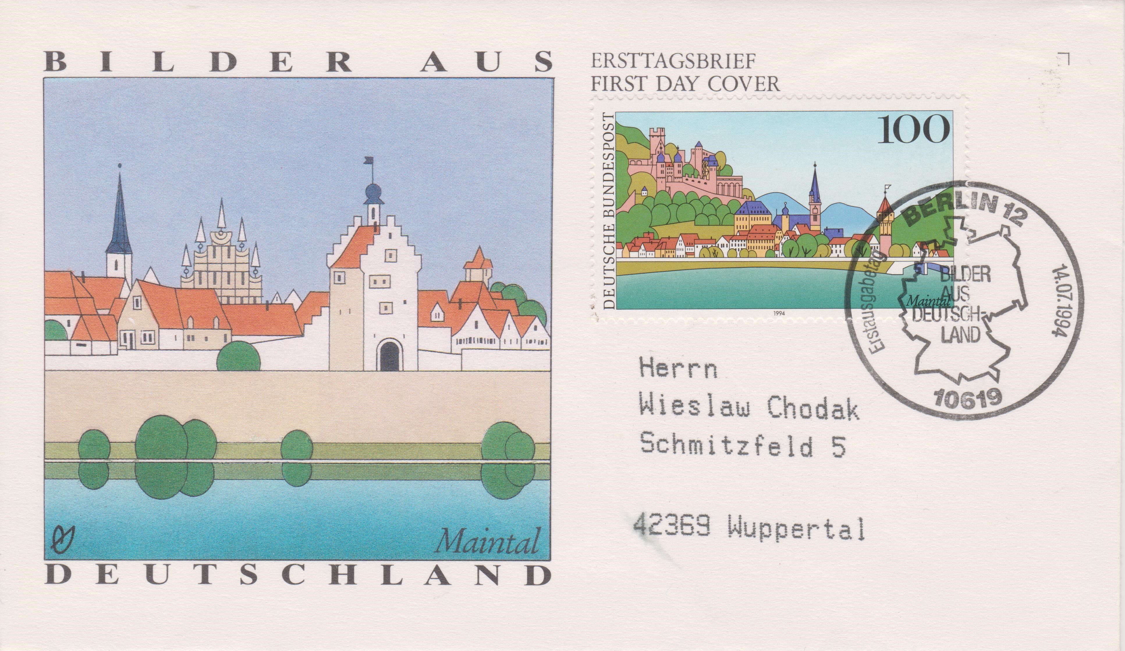 Bund MiNr. 1744 aus der Serie "Bilder aus Deutschland" zeigt Wertheim im Maintal, hier auf echt gelaufenem Ersttagsbrief vom 14.07.1994 mit Ersttagssonderstempel 10619 BERLIN 12: