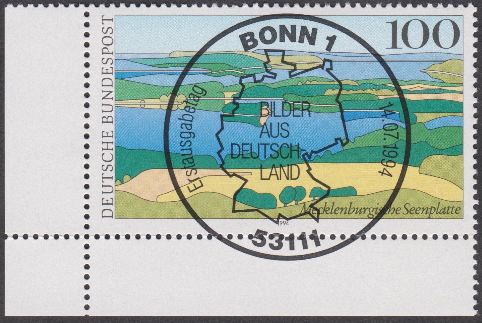Bund MiNr. 1745 aus der Serie "Bilder aus Deutschland" zeigt die Mecklenburgische Seenplatte (Müritz-Nationalpark), hier eine linke untere Bogenecke mit Ersttagssonderstempel 53111 BONN 1 vom 14.07.1994: