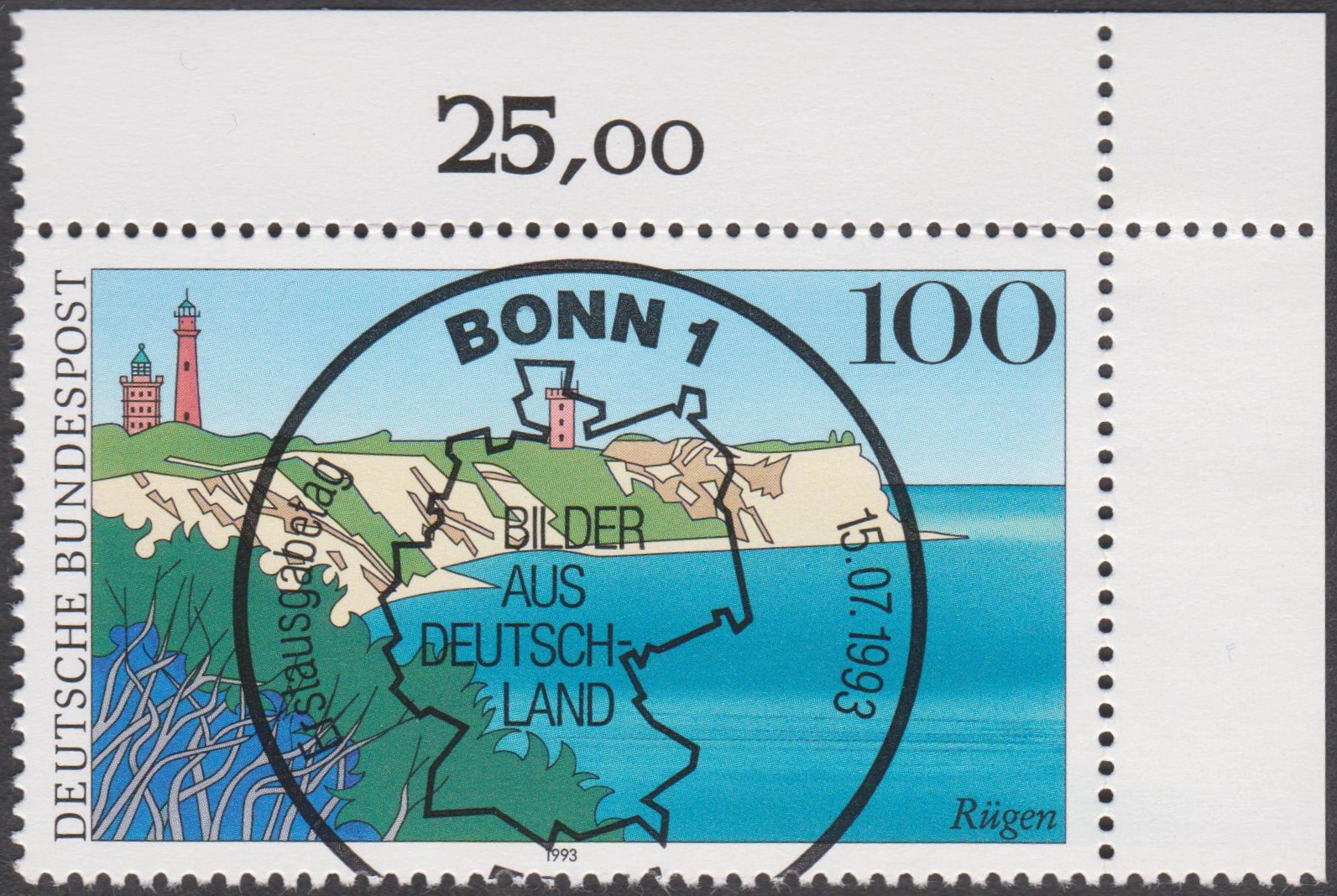 Bund MiNr. 1684 aus der Serie "Bilder aus Deutschland" zeigt Rügen und das Kap Ankona, hier eine rechte obere Bogenecke mit Ersttagssonderstempel 53111 BONN 1 vom 15.07.1993: