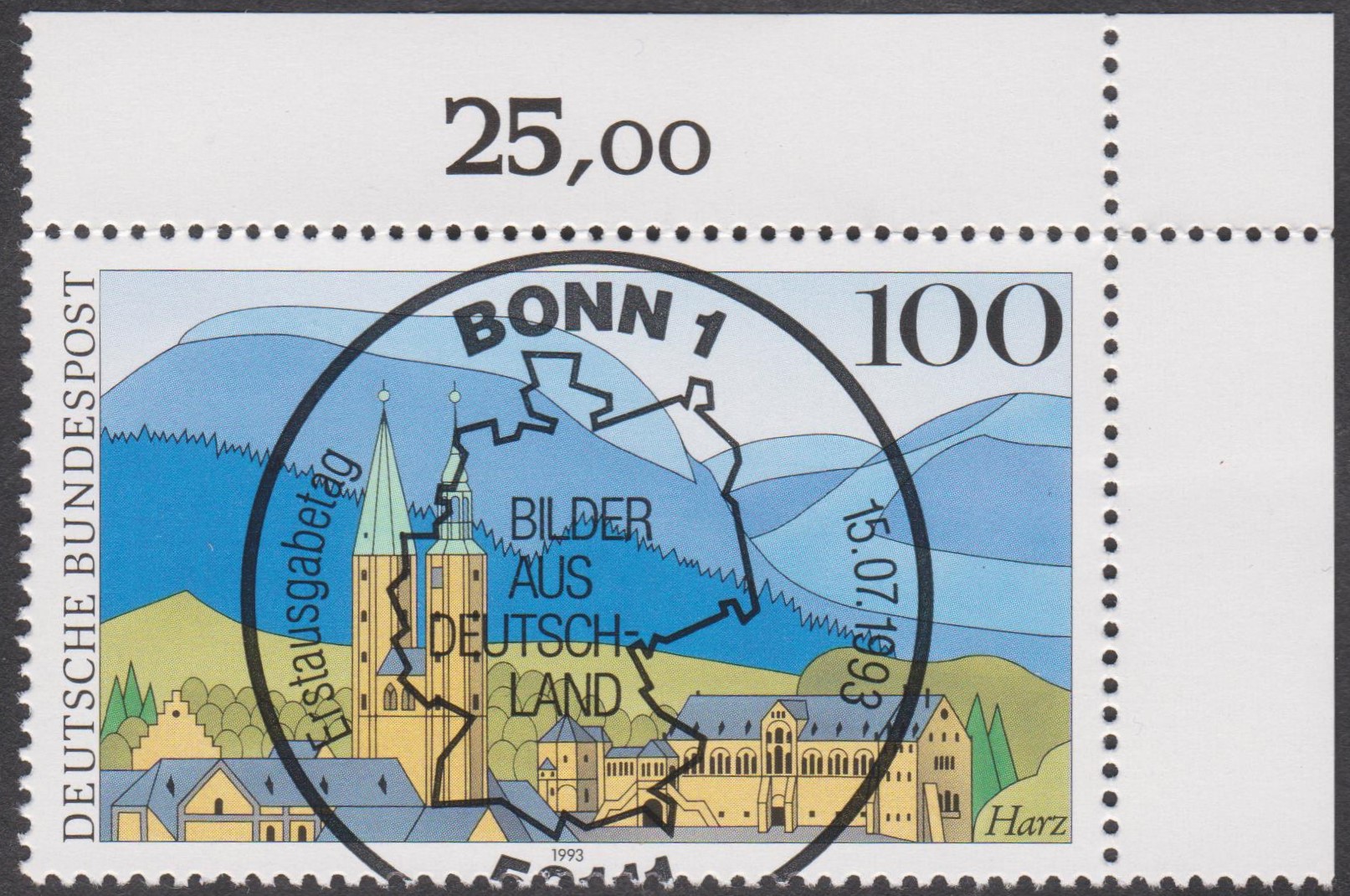 Bund MiNr. 1685 aus der Serie "Bilder aus Deutschland" zeigt Goslar im Harz, hier eine rechte obere Bogenecke mit Ersttagssonderstempel 53111 BONN 1 vom 15.07.1993: