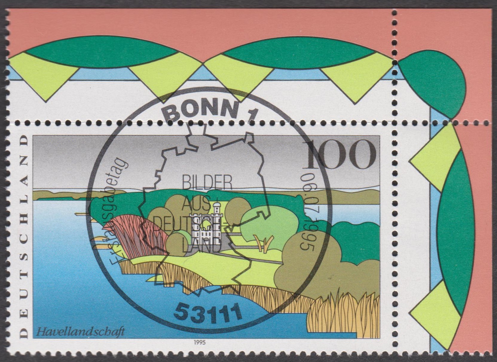 Bund MiNr. 1808 aus der Serie "Bilder aus Deutschland" zeigt die Havellandschaft in Berlin (Pfaueninsel), hier ein Eckrandstück rechts oben mit Ersttagssonderstempel 53111 BONN 1 vom 06.07.1995: