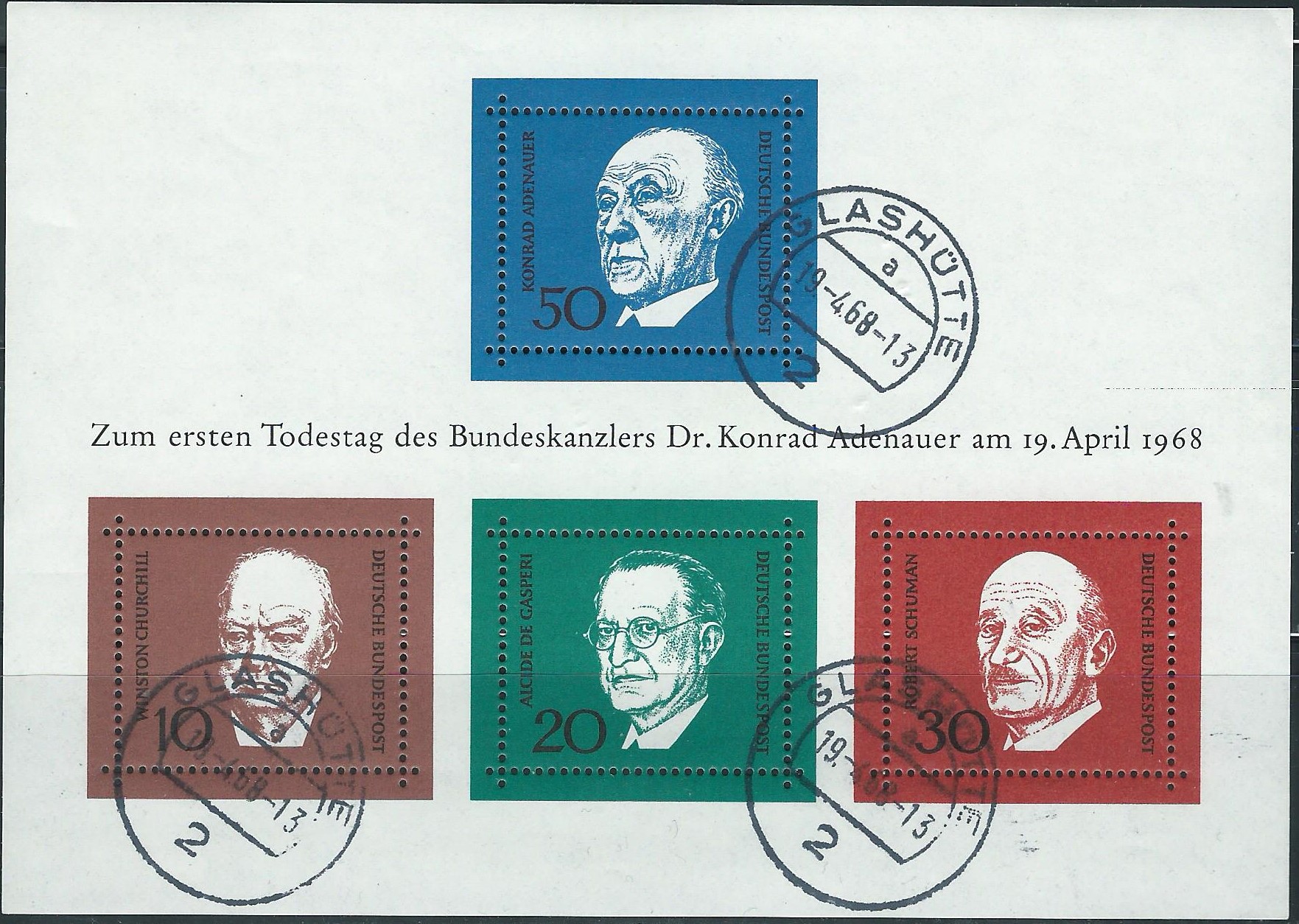 Erschienen ist der Block 4 am 19.4.1968 zum Anlass „1. Todestag von Konrad Adenauer“. Konrad Adenauer war der erste deutsche Bundeskanzler und lebte von 1876 bis 1967. Ihm zu Ehren ist die obere blaue Marke zu 50 Pf gewidmet. Die weiteren 3 Werte zu 10, 20 und 30 Pf zeigen bedeutende Staatsmänner, mit denen er in der Anfangszeit der jungen Bundesrepublik zusammengearbeitet hat. Es sind Sir Winston Churchill (britischer Staatsmann), Alcide de Gasperi (italienischer Staatsmann) sowie Robert Schuman (französischer Politiker). Der hier im Bild gezeigte Block wurde am Erstausgabetag 19.4.68 in Glashütte gestempelt.
