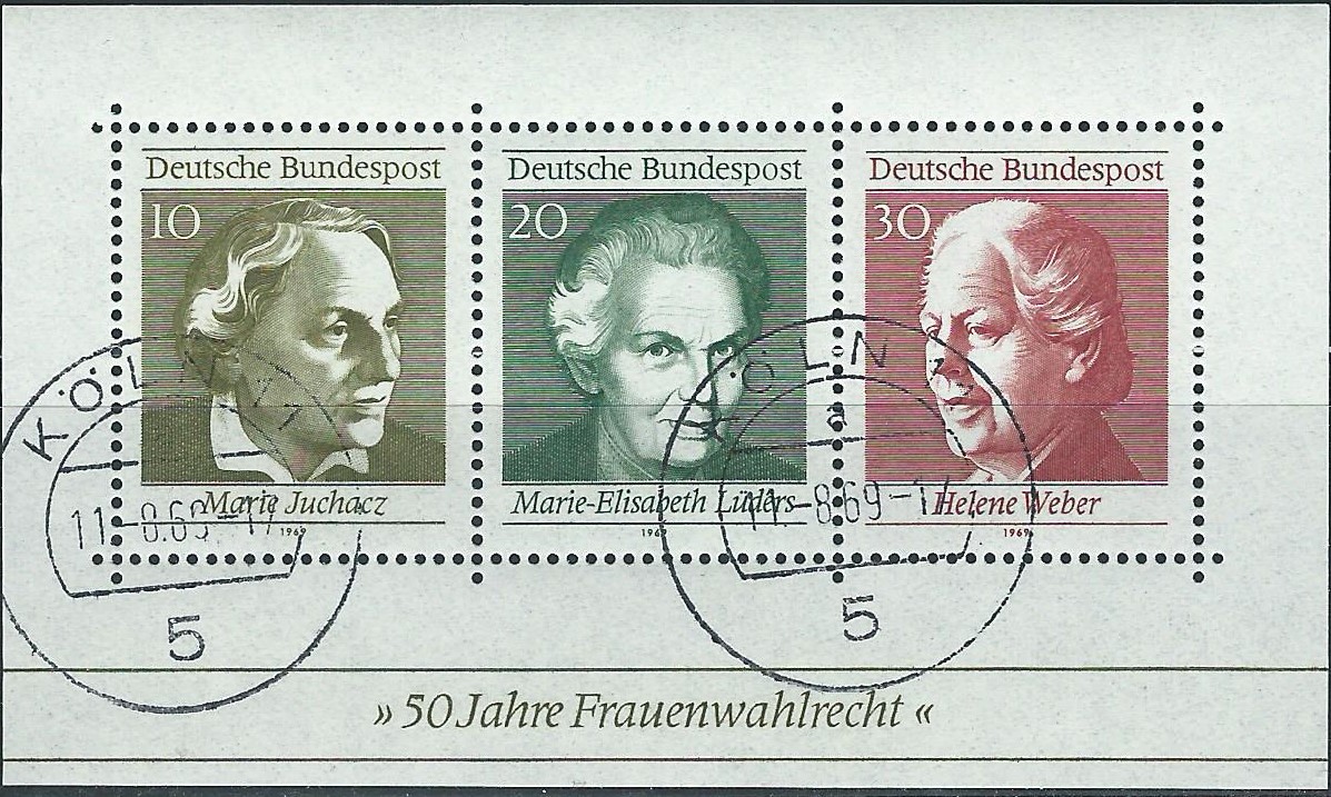 Die nächste Ausgabe ist dann Block 5 vom 11.8.69. Ausgabeanlass war „50 Jahre Frauenwahlrecht“. Nähere Infos dazu hier: https://www.lpb-bw.de/12_november.html" target="_blank Auf den Marken sind führende Politikerinnen der deutschen Frauenbewegung abgebildet. Der Wert zu 10 Pf zeigt Marie Juchacz, der Wert zu 20 Pf Marie-Elisabeth Lüders und er Wert zu 30 Pf Helene Weber. Der hier im Bild gezeigte Block wurde am Erstausgabetag 11.8.69 in Köln 11 gestempelt.