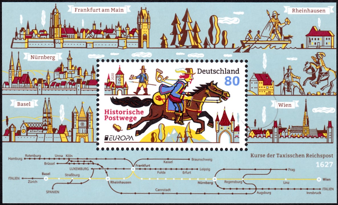 Heute will ich mal wieder die "Blockreihe" fortsetzen. Die Blockausgabe Europa 2020 "Historische Postrouten" hat die MiNr Block 86. Hier zeige ich einen postfrischen Block: