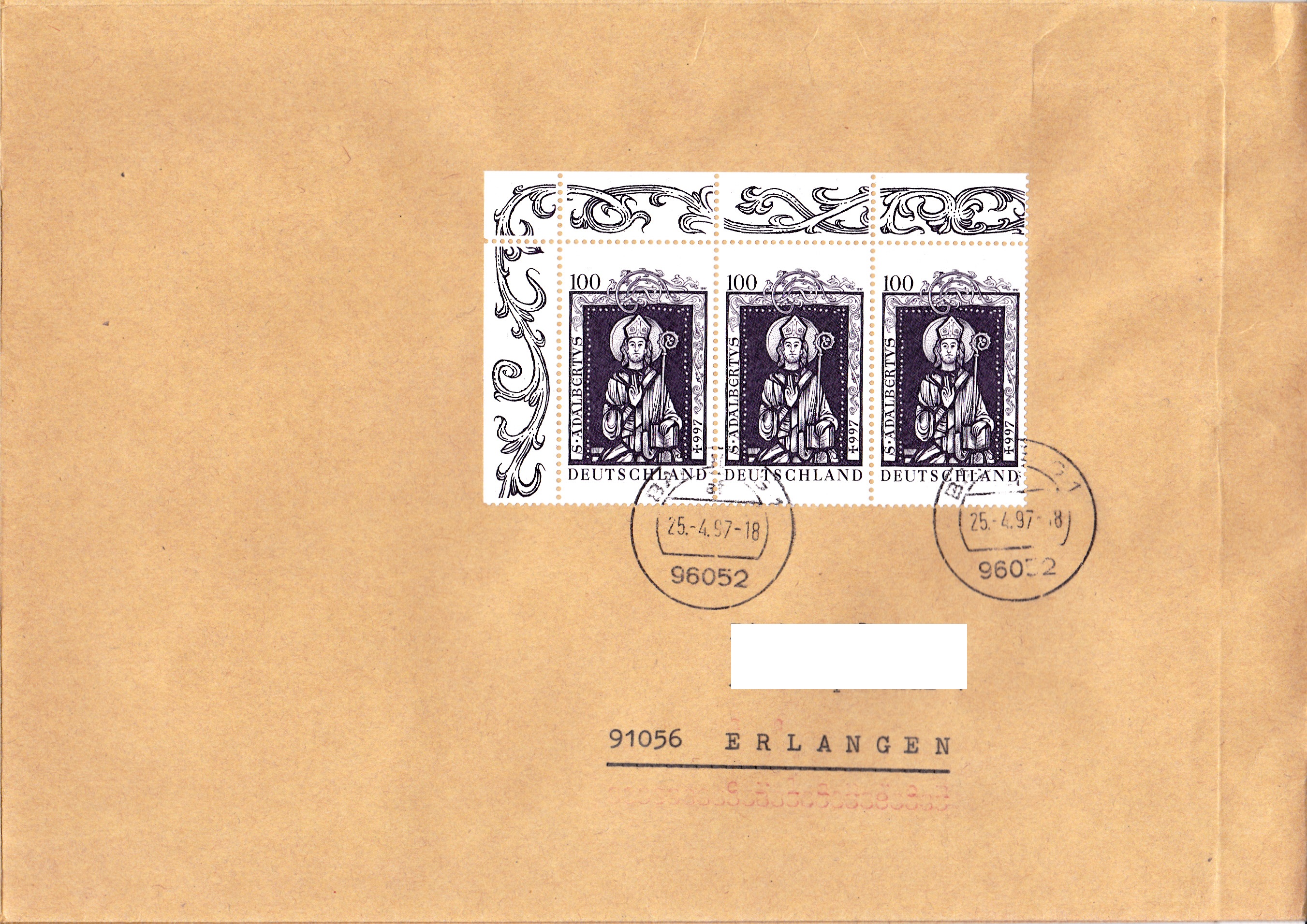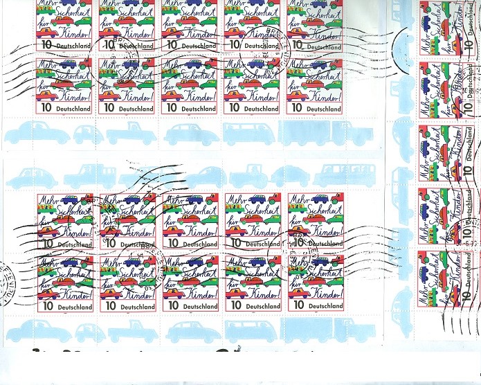 Detail eines Großbriefes mit Mehrfachfrankatur des Zehnerbogens der MiNr. 1954. Entwertung der Frankatur erfolgte mittels Handrollstempel (BZ 30, Pattensen/Hannover). Handrollstempel kommen gern zum Einsatz bei Großbriefen (vorhandener Platz für die lange Stempel"bahn") und Mehrfach- sowie Massenfrankaturen (Zeitaufwand wegen Entwertung der Frankatur).