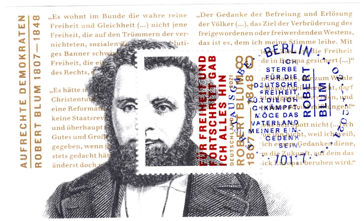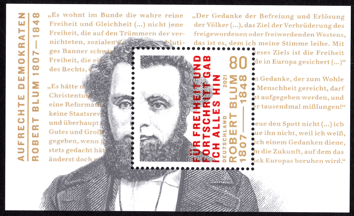 Dieser Block (MiNr Block 89 mit Marke MiNr 3637) aus der Ausgabe-Reihe "Aufrechte Demokraten" istb im Gegensatz zu den vorangegangenen kein sogenannter "Philatelieblock". Er erschien auf Veranlassung des Finanzministeriums. Er zeigt ein Porträt von Robert Blum (1807–1848; deutscher Schriftsteller und Politiker) und ein Zitat.