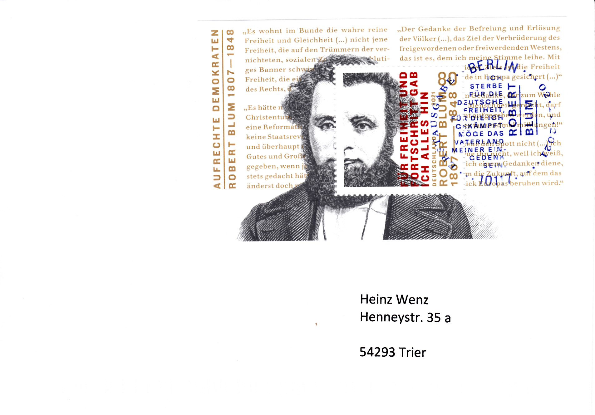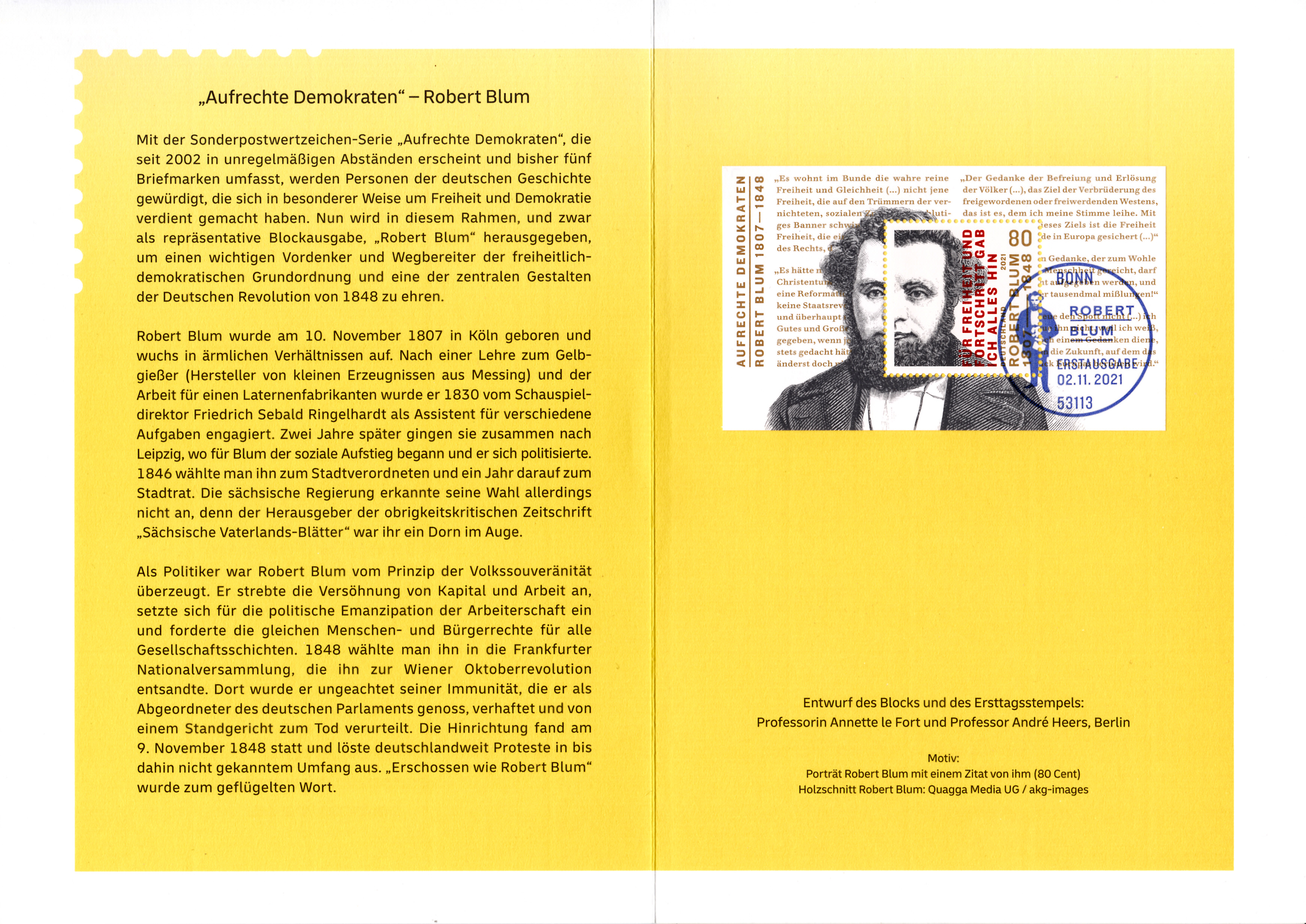 Ministerkarte des Bundesministers für Finanzen mit dem Block der Deutschen Post (MiNr Block 89 mit Marke MiNr 3637) aus der Serie "Aufrechte Demokraten" mit Robert Blum und dem Ersttagsonderstempel Berlin. Wegen der Bundestagswahl am 26.9.2021 gab es am Tag der Ausgabe der Marken im November nur einen "geschäftsführenden" Finanzminister. Die Ministerkarten tragen daher keine Unterschrift des Ministers.