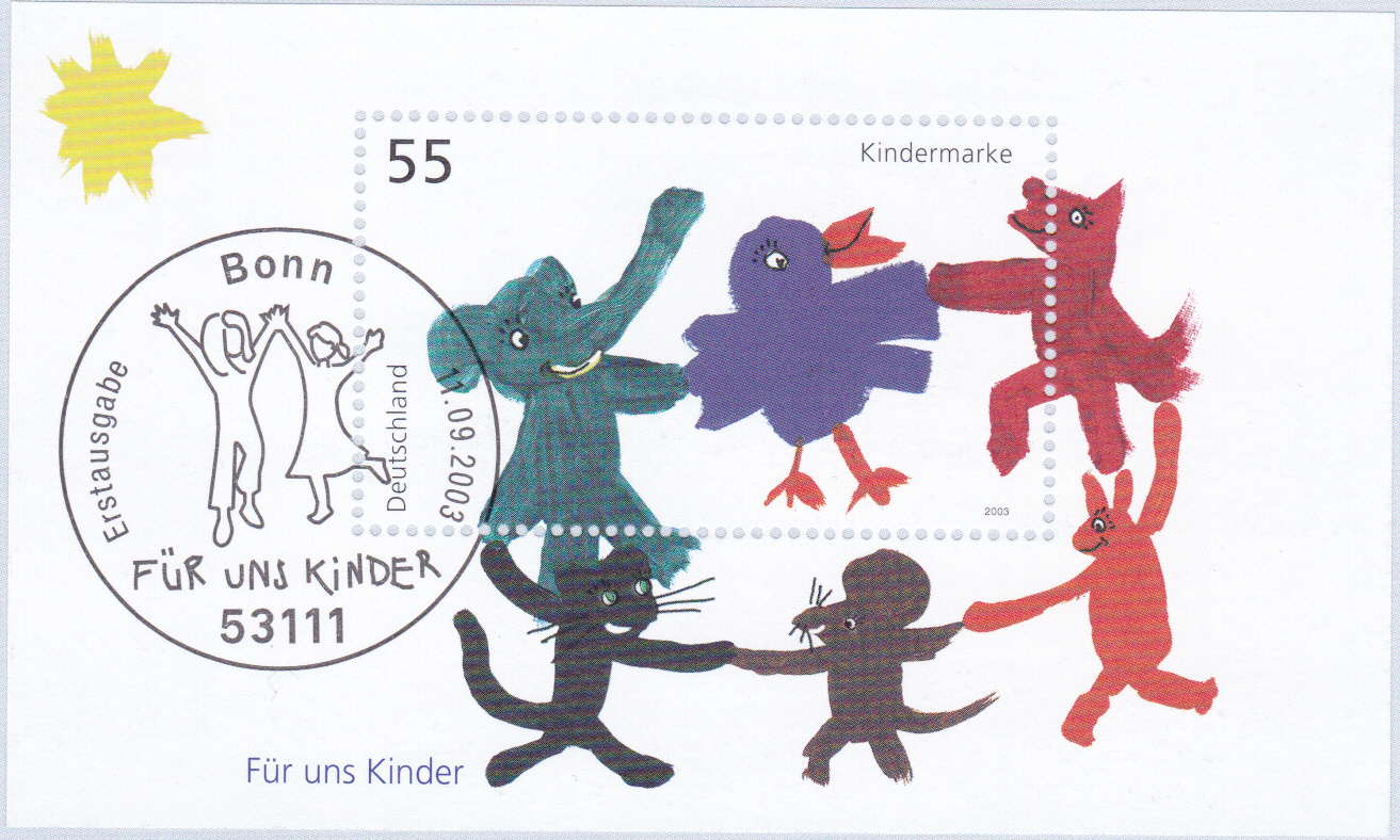 Auch den Block (MiNr Block 64) "Für uns Kinder" bilde ich mit dem Ersttagsonderstempel Bonn ab.