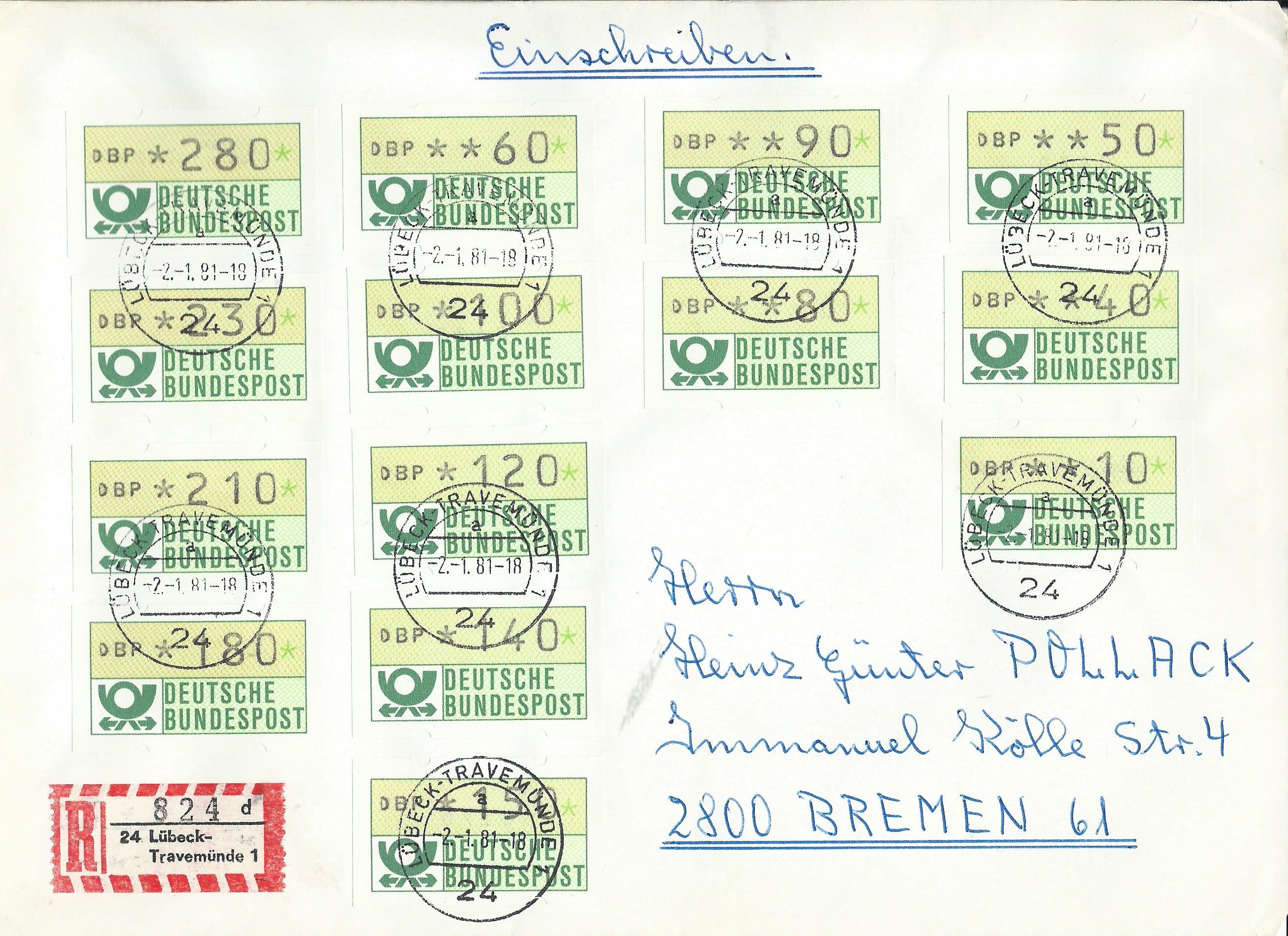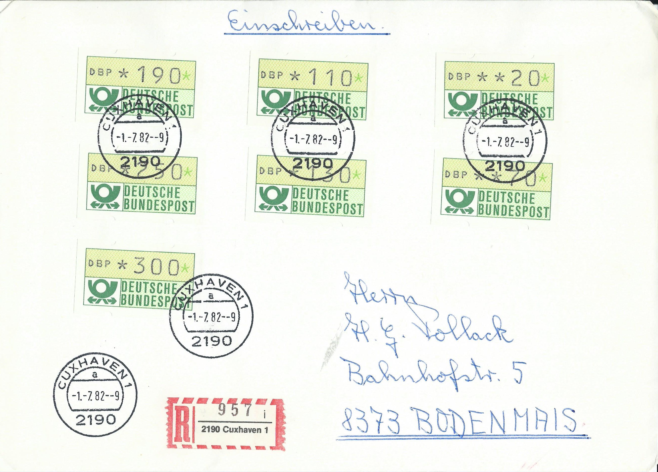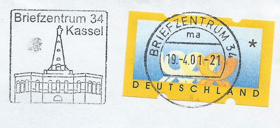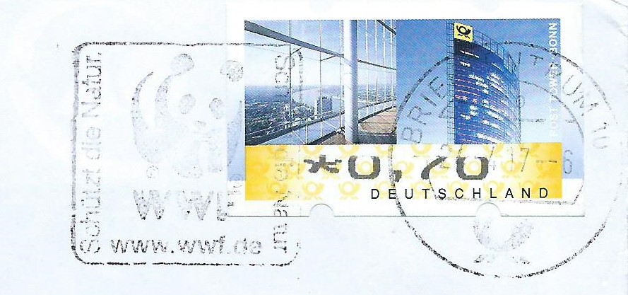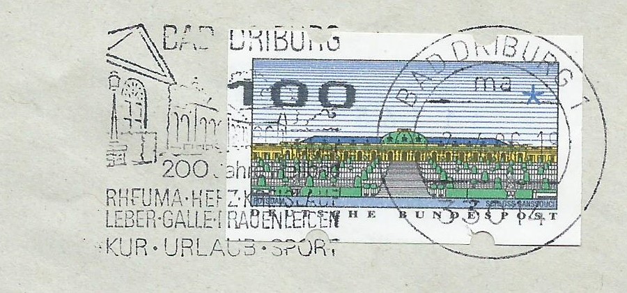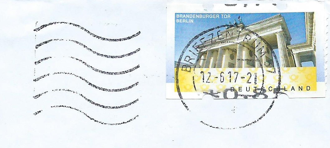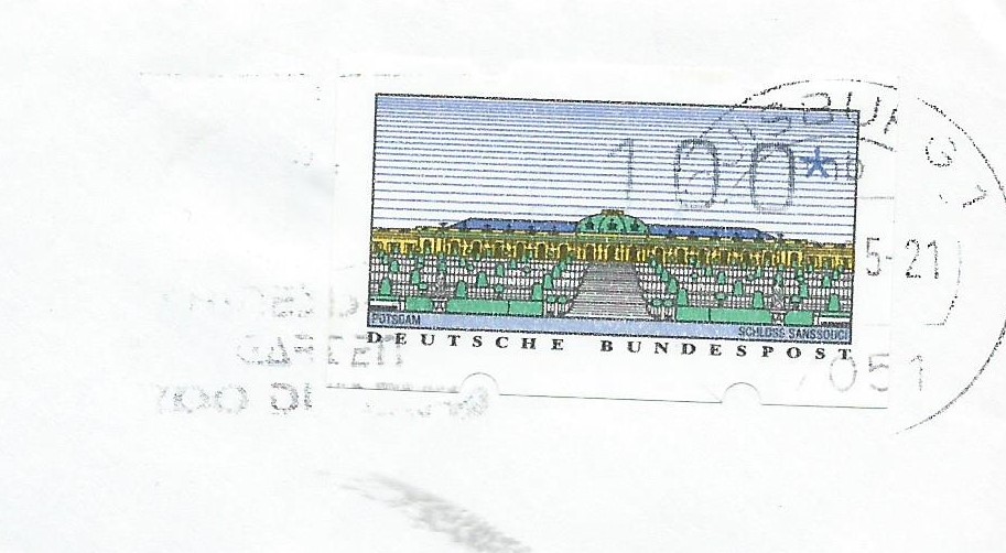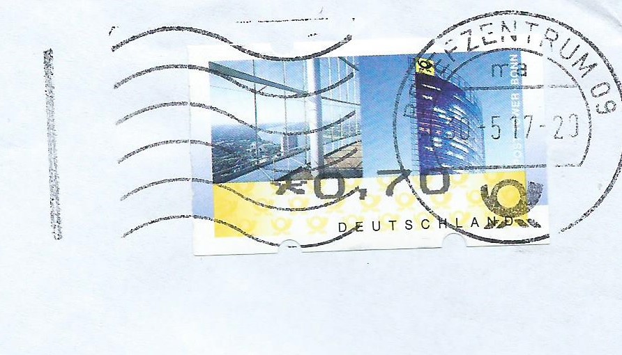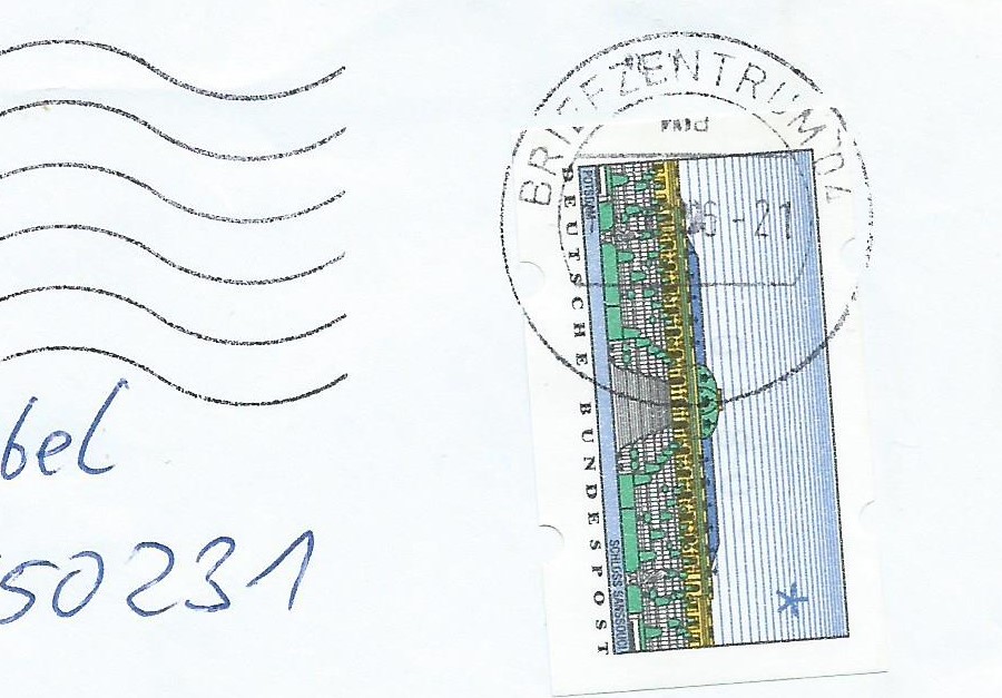 Den Anfang macht das Vordruckpapier der zweiten Ausgabe. Hier wurde ein Leerfeld, also ein Markenvordruck ohne Wertaufdruck, als Frankatur verklebt und unbeanstandet befördert. Abgestempelt wurde die Sendung im Briefzentrum 04 am 11.6.96. Man kann auch noch gut erkennen, dass es sich um eine „Marke“ mit Nummer handelt, die Nummer scheint durch das Papier.