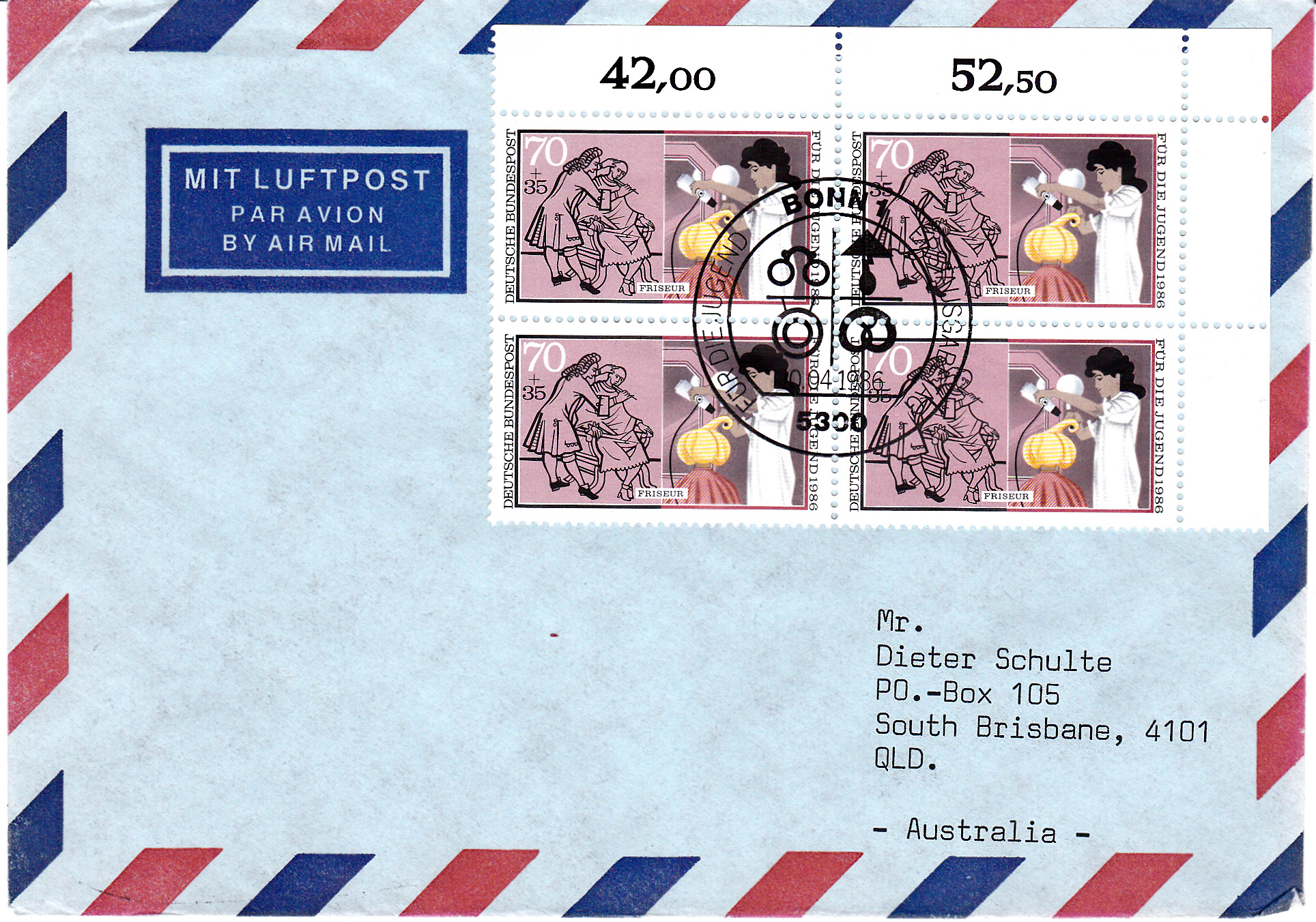 Viermal 70+35-Pfennigwert aus der Jugendmarkenerie 1986 (MiNr 1276) auf einem Luftpostbrief nach Australien mit Ersttagsonderstempel vom 10.4.1986 aus Bonn. Das Porto berechnet sich wie folgt: Brief bis 20 g ins Ausland 120Pf, Luftpostzuschlag für viermal je angefangene 5 g Länderzone 3 (Australien, Ozeanien ohne Osterinseln, Papua-Neuguinea) 4 x 40Pf ergibt insgesamt 280Pf.