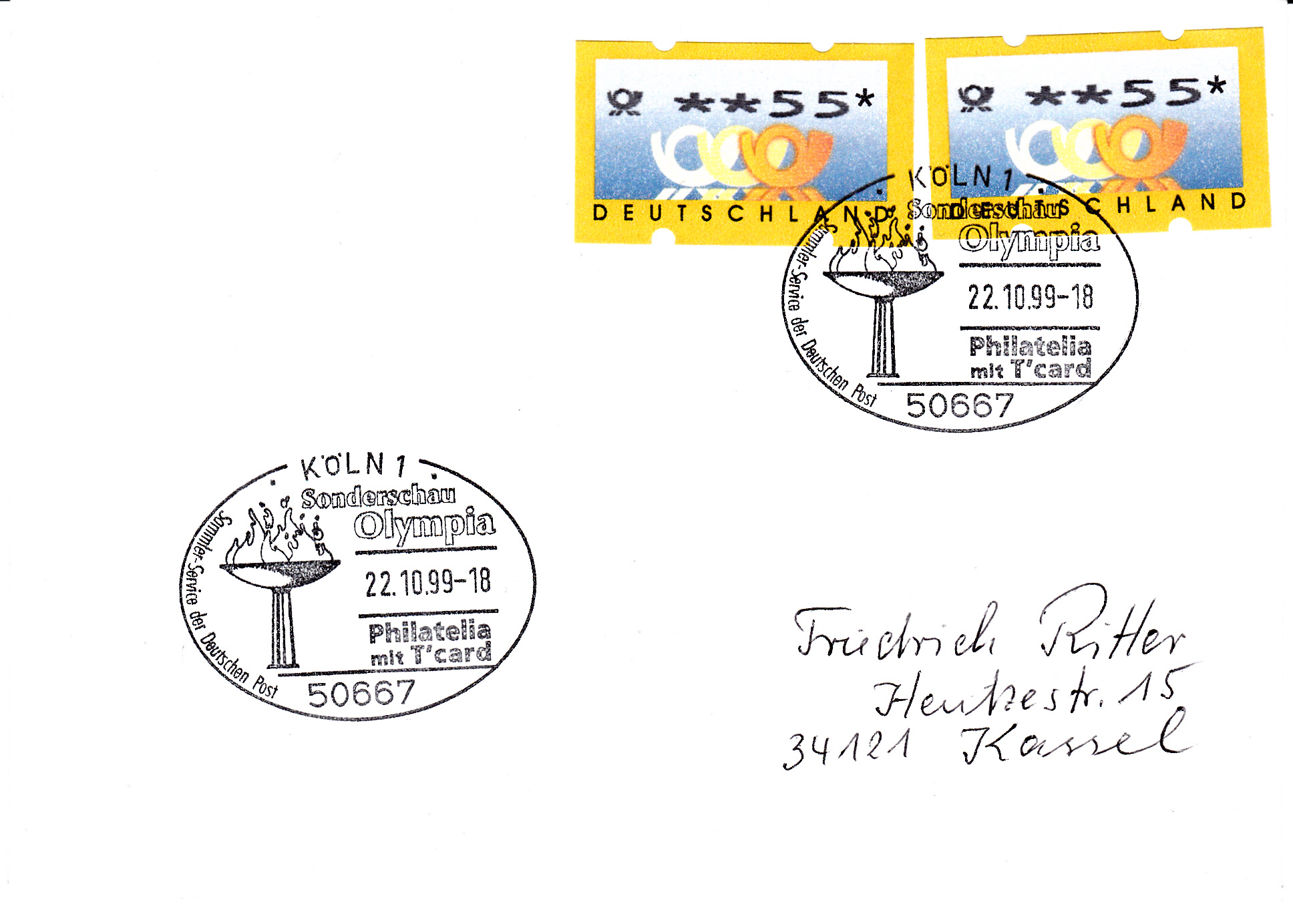 Zwei Automatenmarken zu 55Pf (MiNr 3.2 (Typ 2 Posthorn, Wertziffern fett, enger Abstand zwischen den Ziffern)) portogerecht auf einem Brief bis 20 g mit Sonderstempel aus Köln 1 vom 22.10.1999 (Ersttag der Automatenmarke) zur Briefmarkenmesse Philatelia mit T'card.
