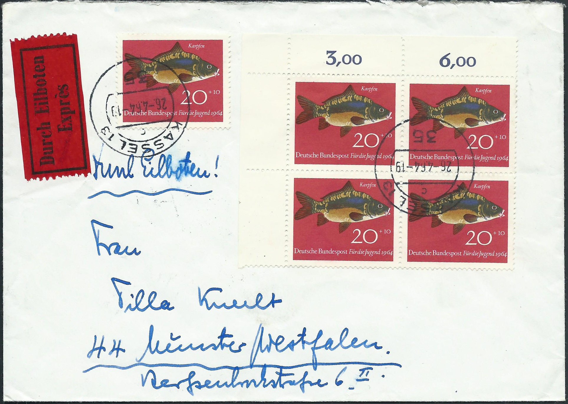 hier eine schöne Mehrfachfrankatur der Mi.Nr. 414 Ausgabe Jugend 1964 Fische, Motiv Karpfen zu 20 Pf. Es wurden 5 Werte davon auf einem Eilbrief verklebt, 4 davon als Eckrand-4-er4-Block oben links. Abgestempelt wurde er am 26.4.65 in Kassel 13.
