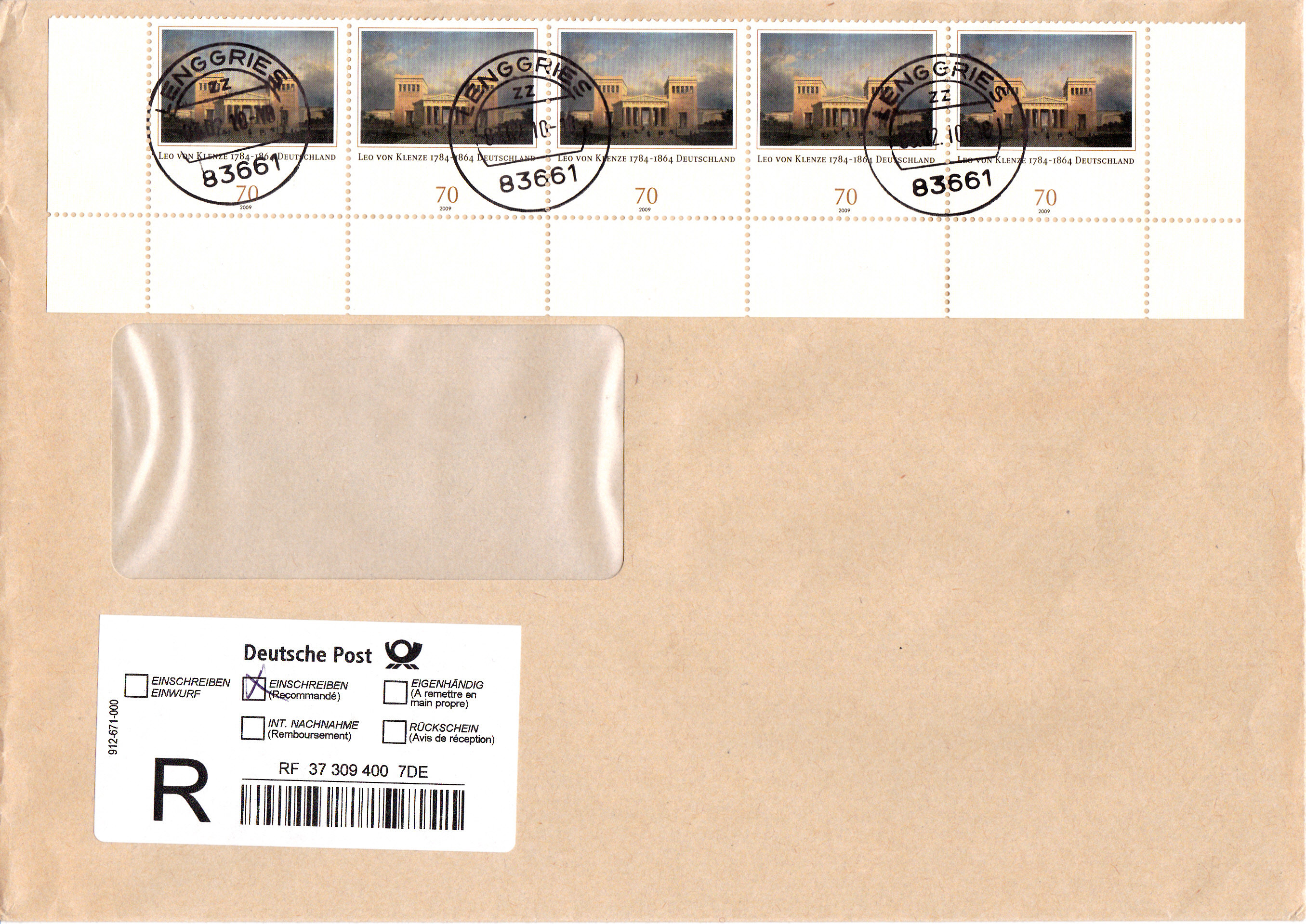 Fünferstreifen vom unteren (halber Bogen mit Unterrand) der Marke zum 225. Geburtstag von Leo von Klenze (MiNr 2719) auf einem Übergabe-Einschreibebrief bis 500 g. Das Porto betrug: 145 Cent für den Brief bis 500 g und 205 Cent für die Zusatzleistung Übergabe-Einschreiben. Somit ist der Brief portogerecht frankiert.