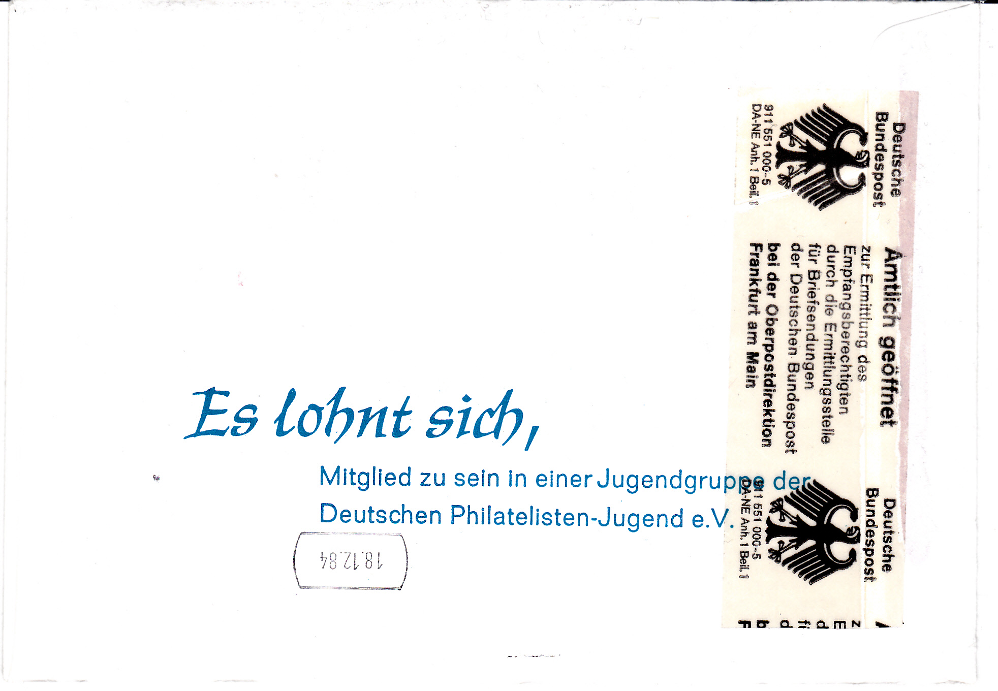 Der Brief wurde dann nach Deutschland zurückgeschickt und, da außen kein Absender angegeben war, am 18.12.1984 bei der OPD Frankfurt amtlich geöffnet und der Absender auf der Vorderseite angebracht. Wo der Brief die fast vier Monate verbracht hat ist nicht ersichtlich.