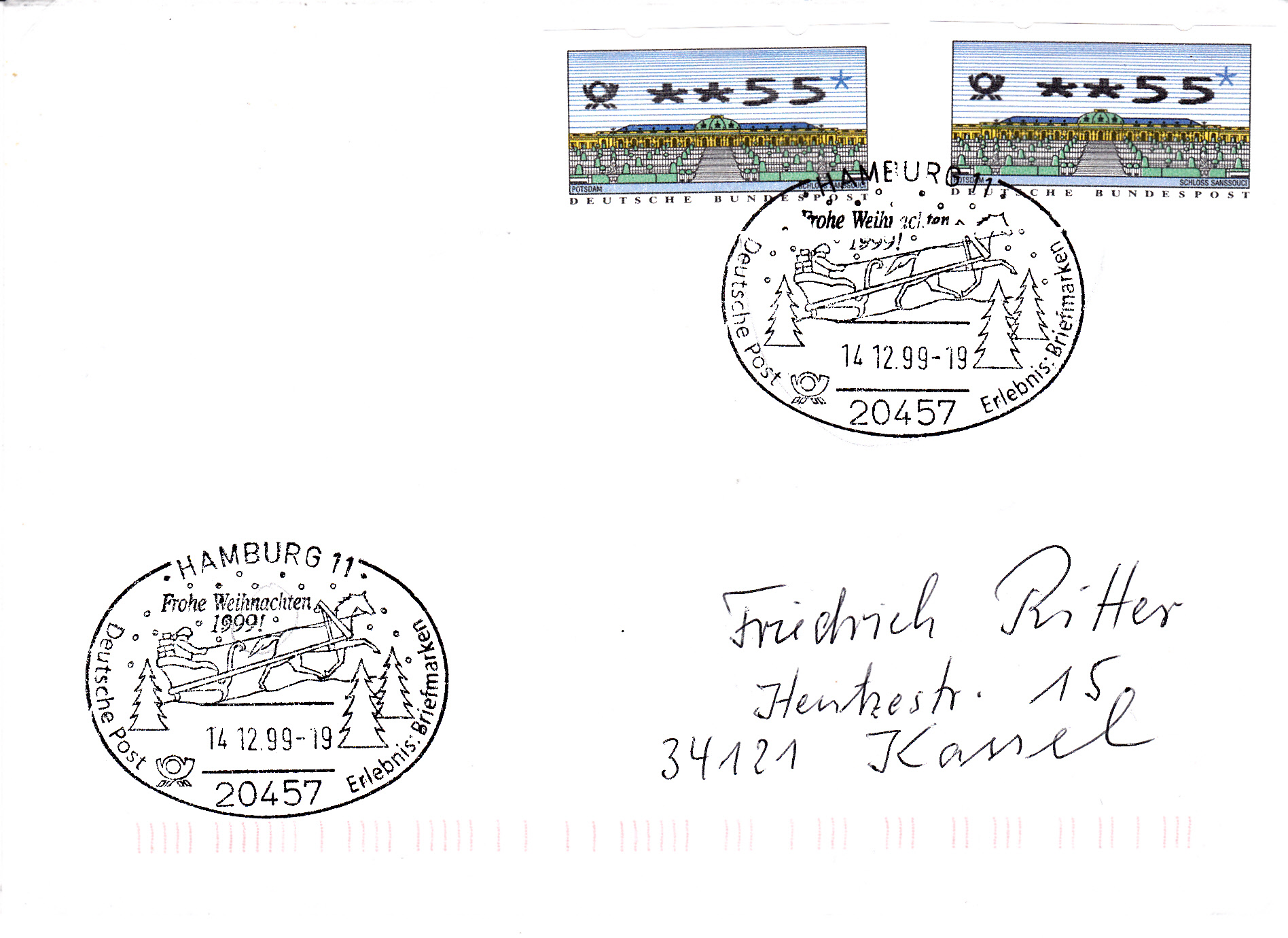 Zwei Automatenmarken zu 55Pf MiNr 2 Typ 2.3 portogerecht auf einem Brief bis 20 g von Hamburg nach Kassel.