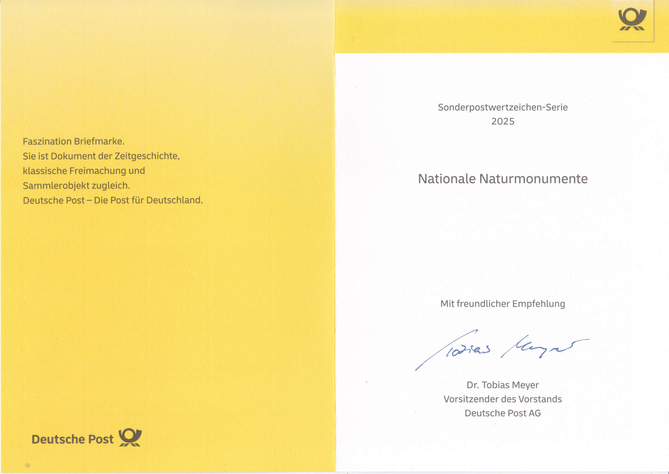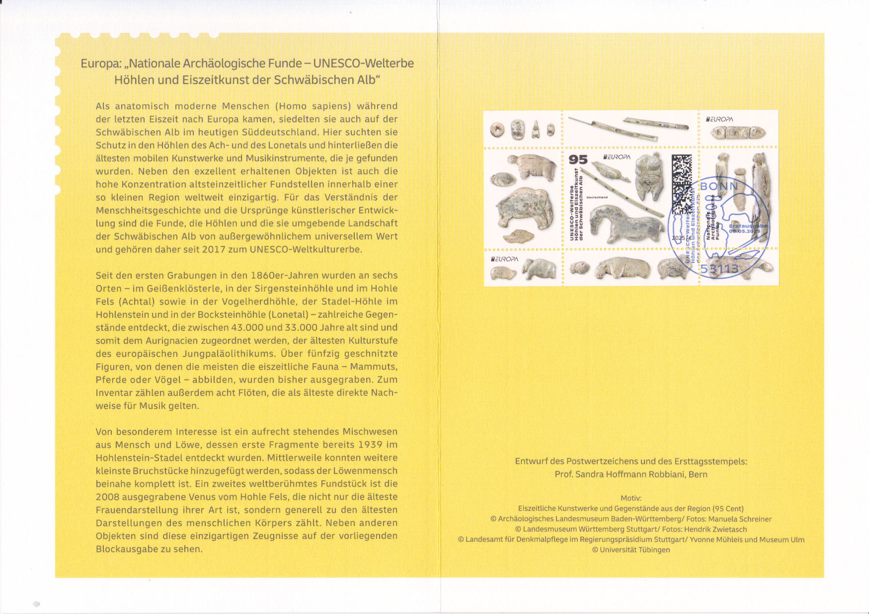 Klappkarte des Vorstandsvorsitzenden der Deutschen Post AG mit dem Block Europa 2025 "Nationale archäologische Funde" 2025 (MiNr Block 94 mit Marke MiNr 3907) mit Motiven zum Thema "Mammutelfenbein- und Knochenfiguren aus den Höhlen Vogelherd, Hohler Fels, Geißenklösterle und Hohlensteinstadel" und dem Ersttagsonderstempel Bonn.