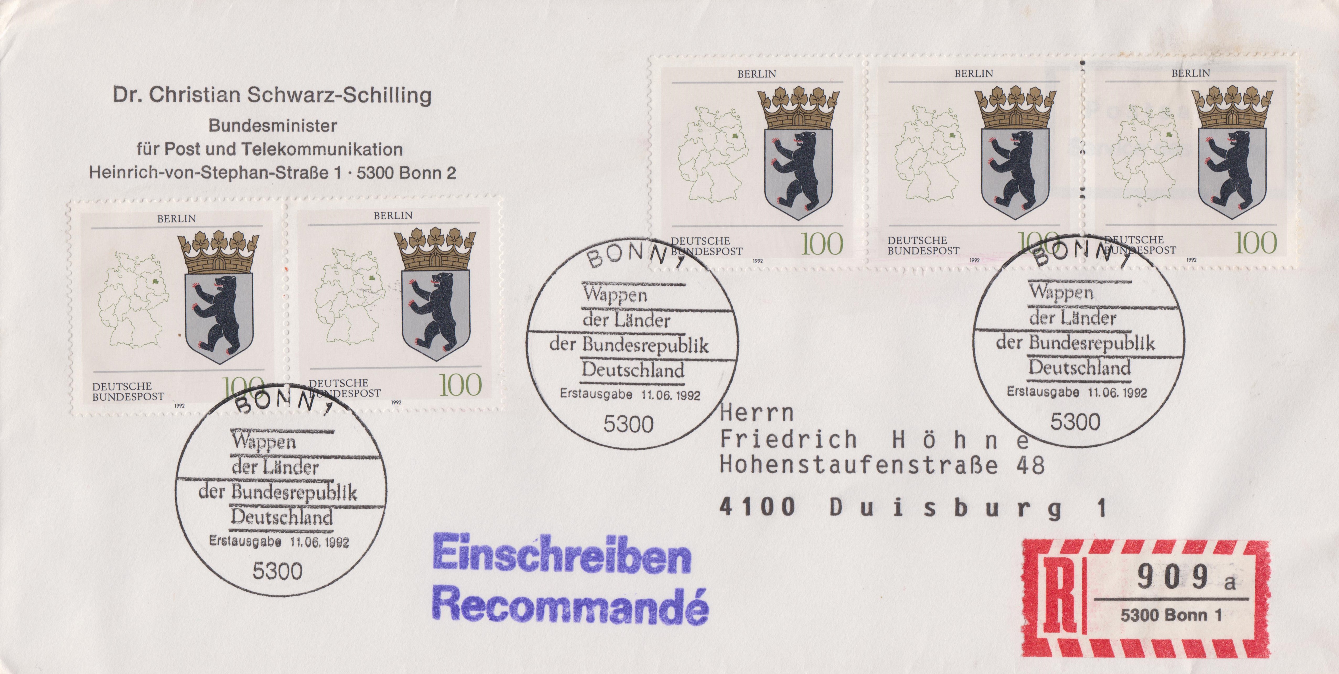 Brief als Einschreiben-Einwurf mit vier Marken zum 150. Geburtstag von Richard Strauss (MiNr 3086) und dem Ersttagsonderstempel vom 5.6.2014 aus Bonn. Das Porto berechnet sich aus Brief bis 20 Gramm 60 Cent, die Zusatzleistung Einwurf-Einschreiben 180 Cent, zusammen also 240 Cent.