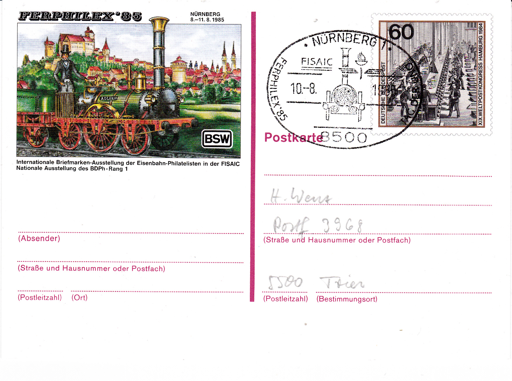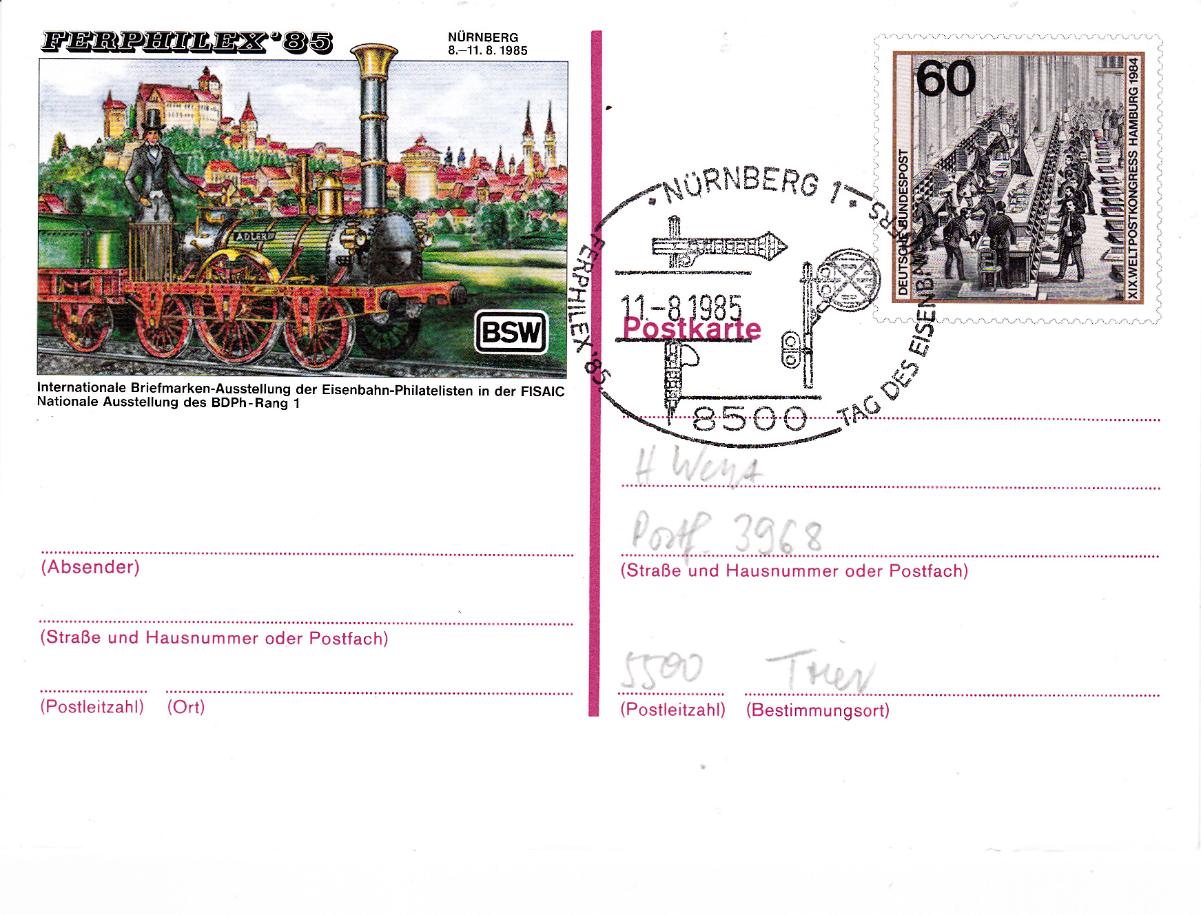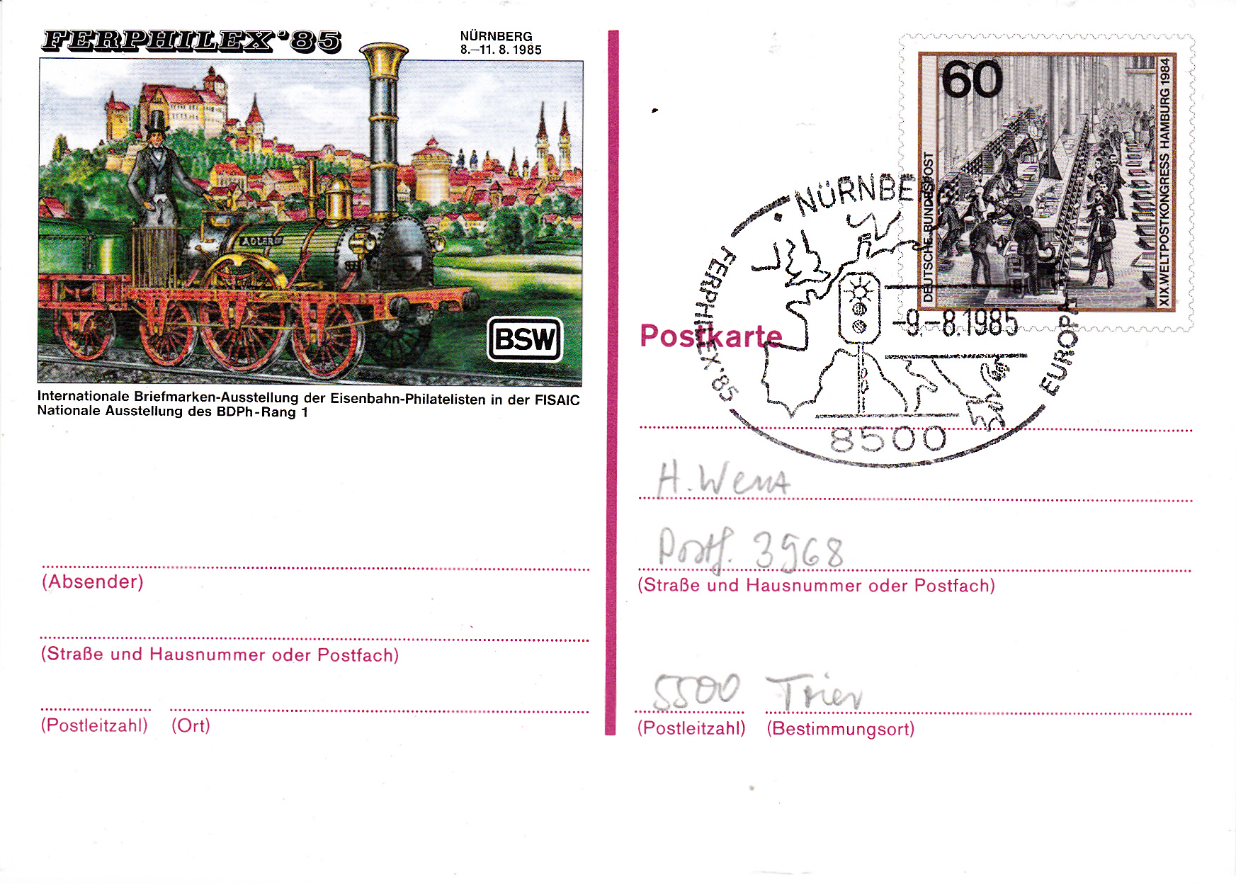 Zur Briefmarkenausstellung FERPHILEX'85 in Nürnberg erschien eine Postkarte als Ganzsache mit dem Sonderwertstempel der Marke zu 60Pf zum XIX. Weltpostkongress 1985 in Hamburg (MiNr 1215).