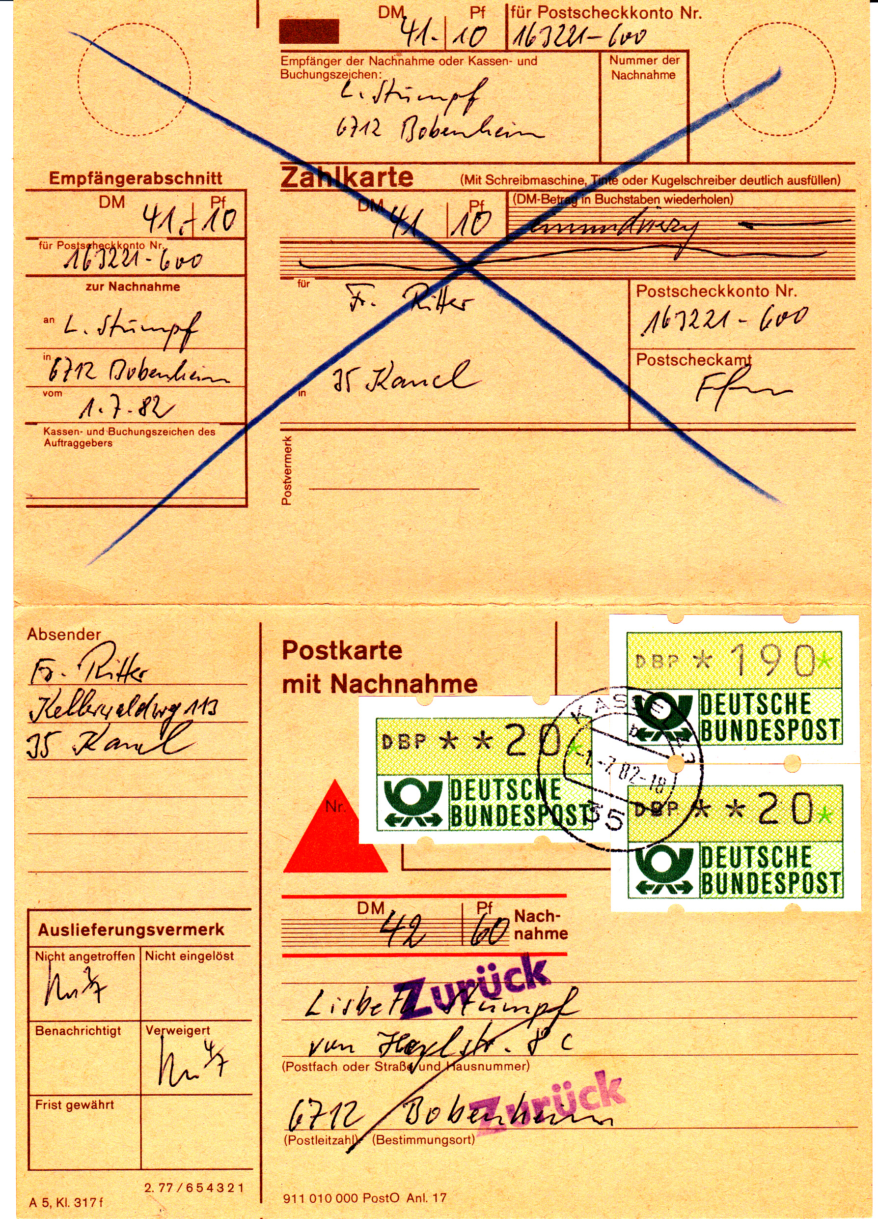 Hier einmal eine Spielerei, die mit Automatenmarken immer gut möglich ist: Ein "Datumsbrief". Das Datum vom Sonderstempel der Veranstaltung in Lauf an der Pegnitz am 28.06.2014 wurde mit 4 Werten zu 0,28, 0,06, 0,20 und 0,14 € dargestellt, zur portorichtigkeit kamen unten noch die Werte zu 0,20 und 0,02 € dazu. Es müssen ja schliesslich 60 ct Porto verklebt sein, sonst hätte die Post den Beleg nicht befördert. Mit den Wunschwerten der Automatenmarken kann man jedes beliebige Datum zusammenstellen, gerade für Sonderstempel oder z. B. Geburtstagsgrüsse immer ein kleiner Frankaturgag