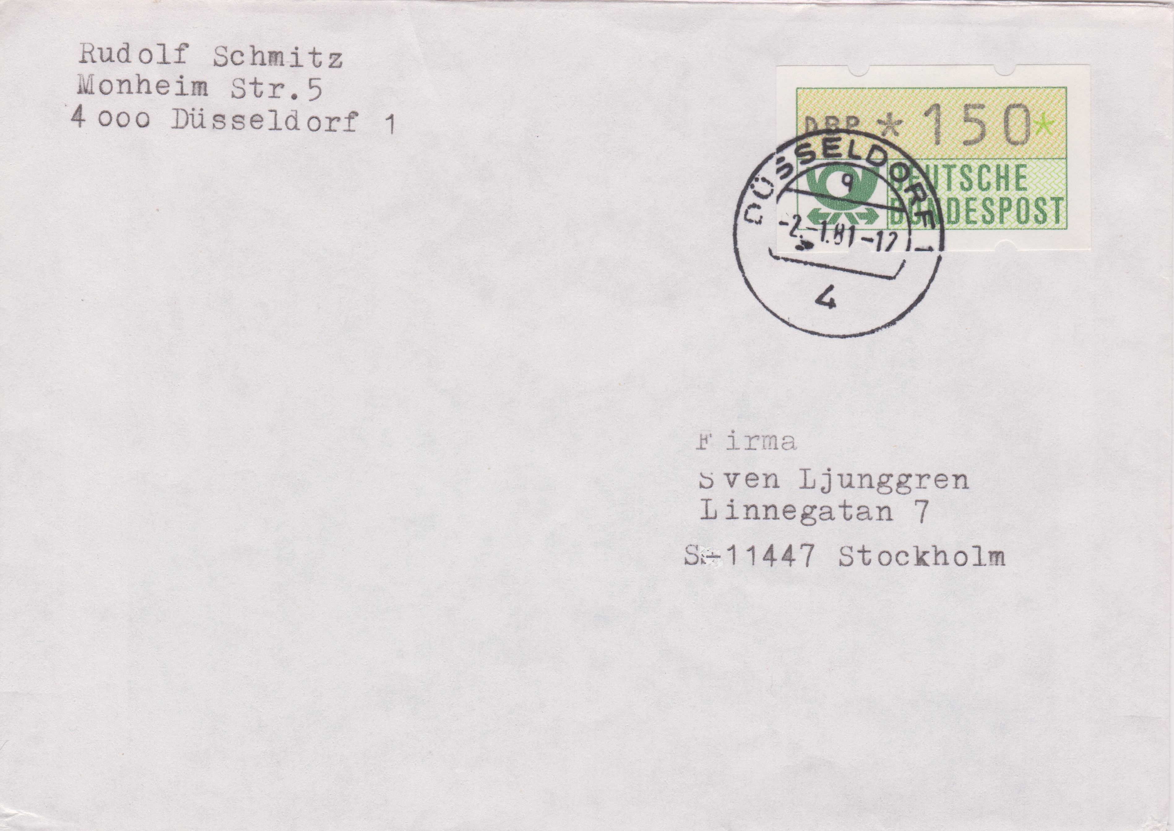ATM MiNr. 1: Einzelfrankatur der Wertstufe 150 Pf am "-2.-1.81" (= Erstausgabetag) ab "4 DÜSSELDORF 1" portogerecht auf Brief nach Schweden von 21 bis 50 g:
